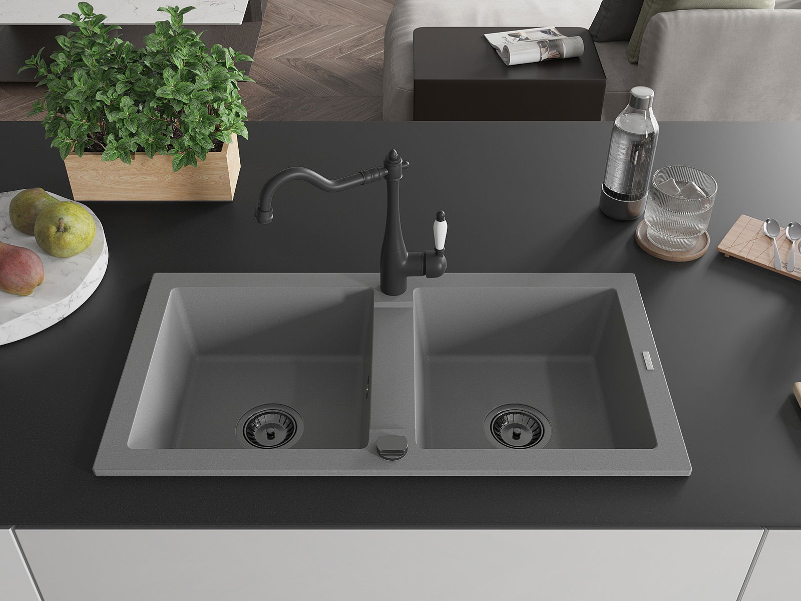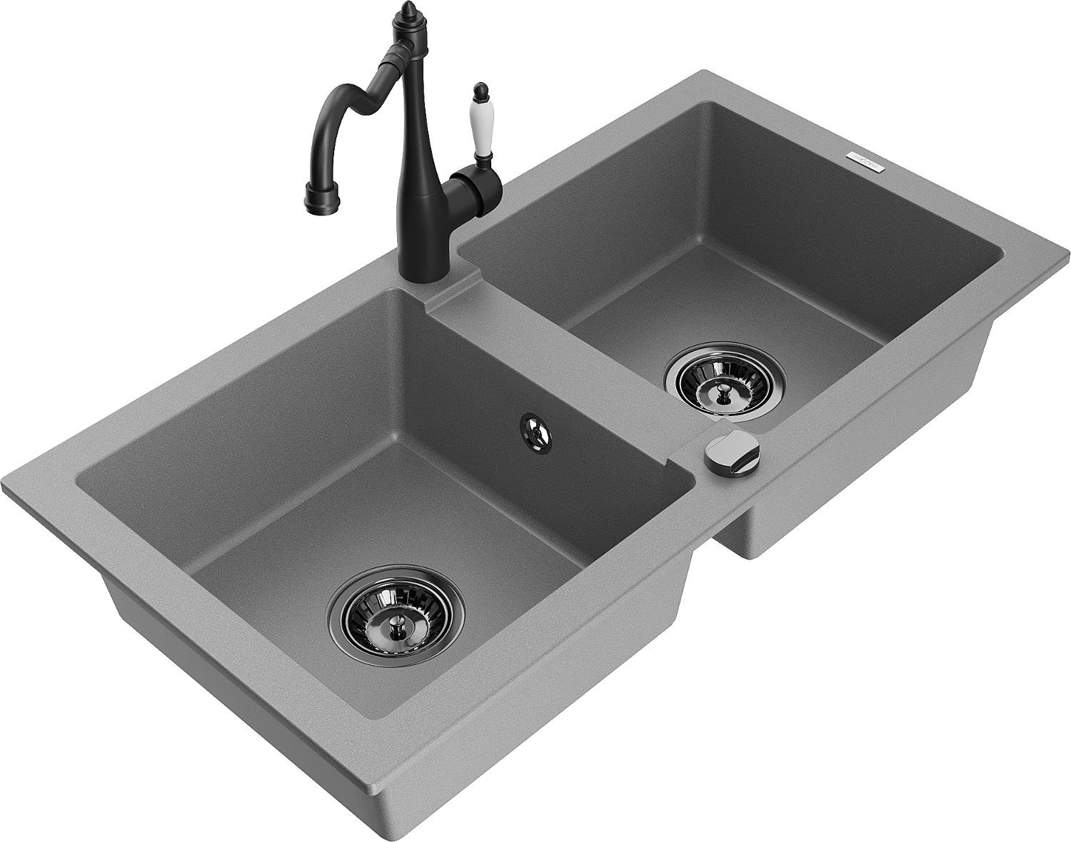 Mexen Mario divu nodalījumu granīta izlietne ar virtuves jaucējkrānu Carla, pelēka - 6504-71-670700-70-B