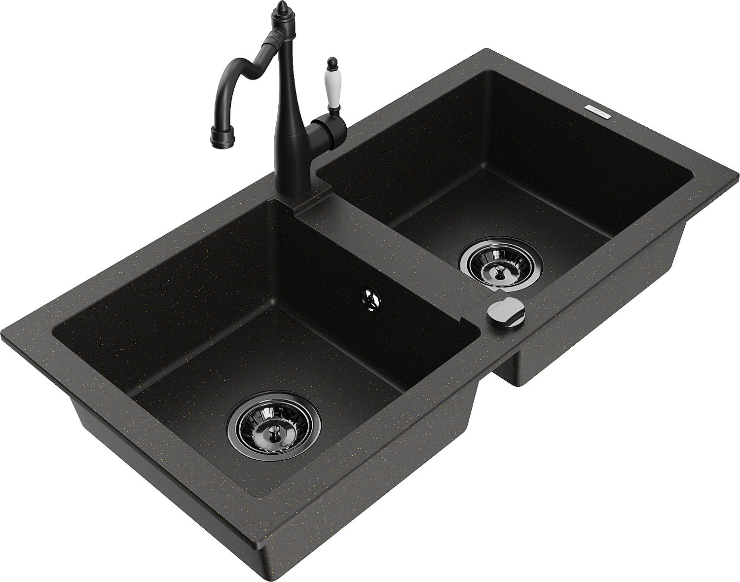 Mexen Mario grānīta divkameru izlietne ar virtuves jaucējkrānu Carla, melns/zeltains metālisks - 6504-75-670700-70-B