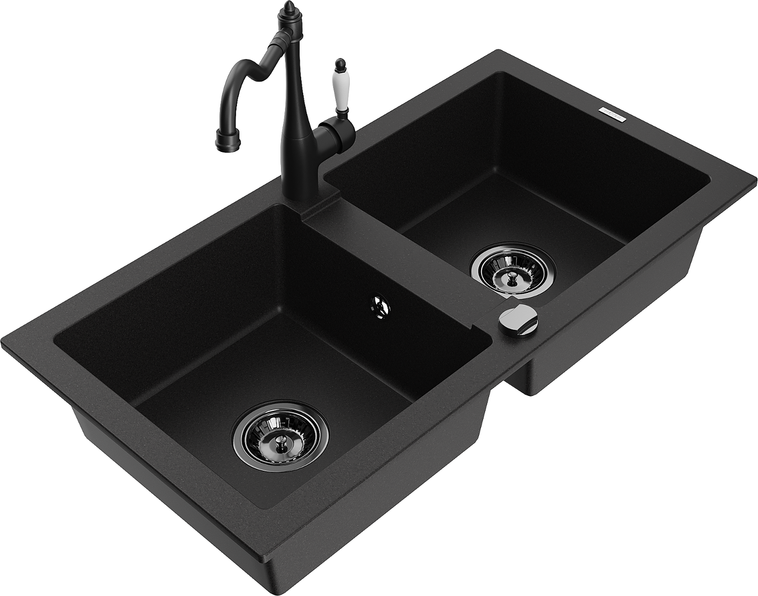 Mexen Mario granīta izlietne ar divām nodalījumiem un virtuves jaucējkrānu Carla, melna - 6504-77-670700-70-B