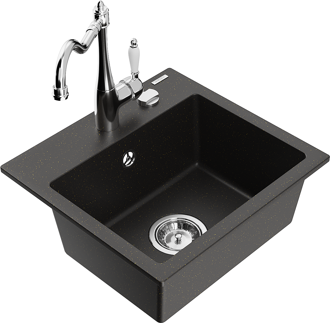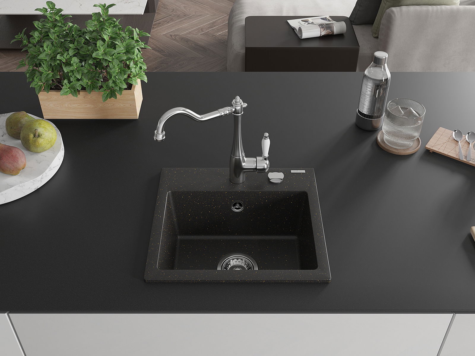 Mexen Milo granitizlietne ar vienu nodalījumu un virtuves jaucējkrānu Carla, melna/zeltīta metāliska - 6505-75-670700-00