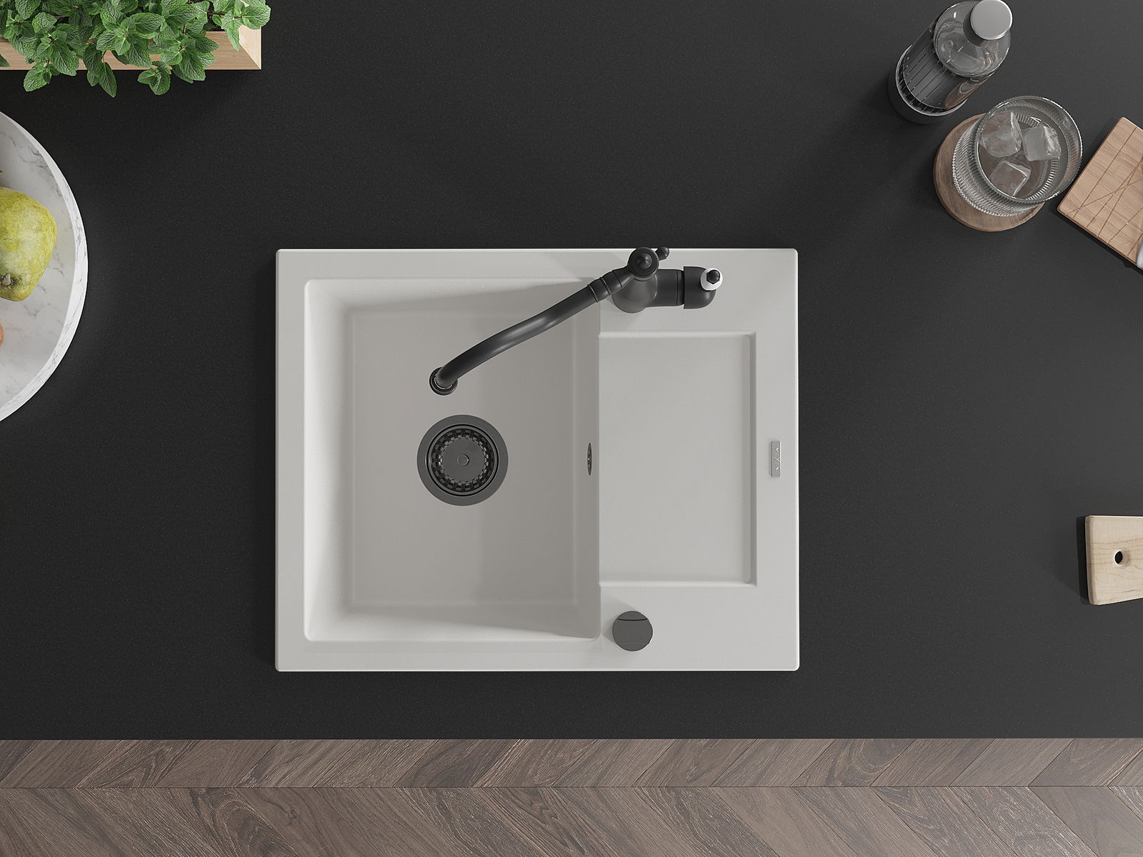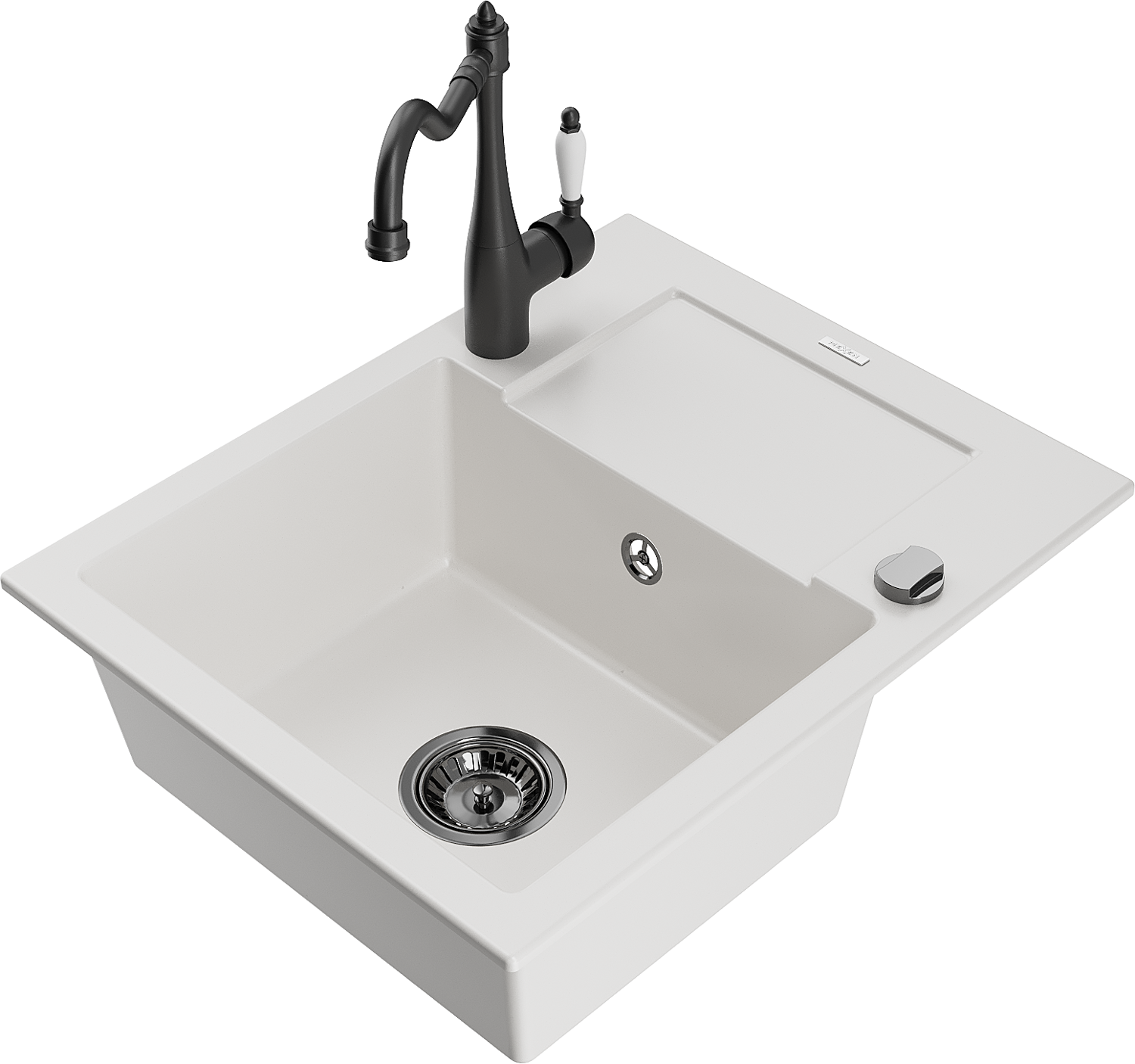 Mexen Enzo granīta izlietne ar 1 nodalījumu un noteces zonu, un virtuves jaucējkrānu Carla, balta - 6506-20-670700-70