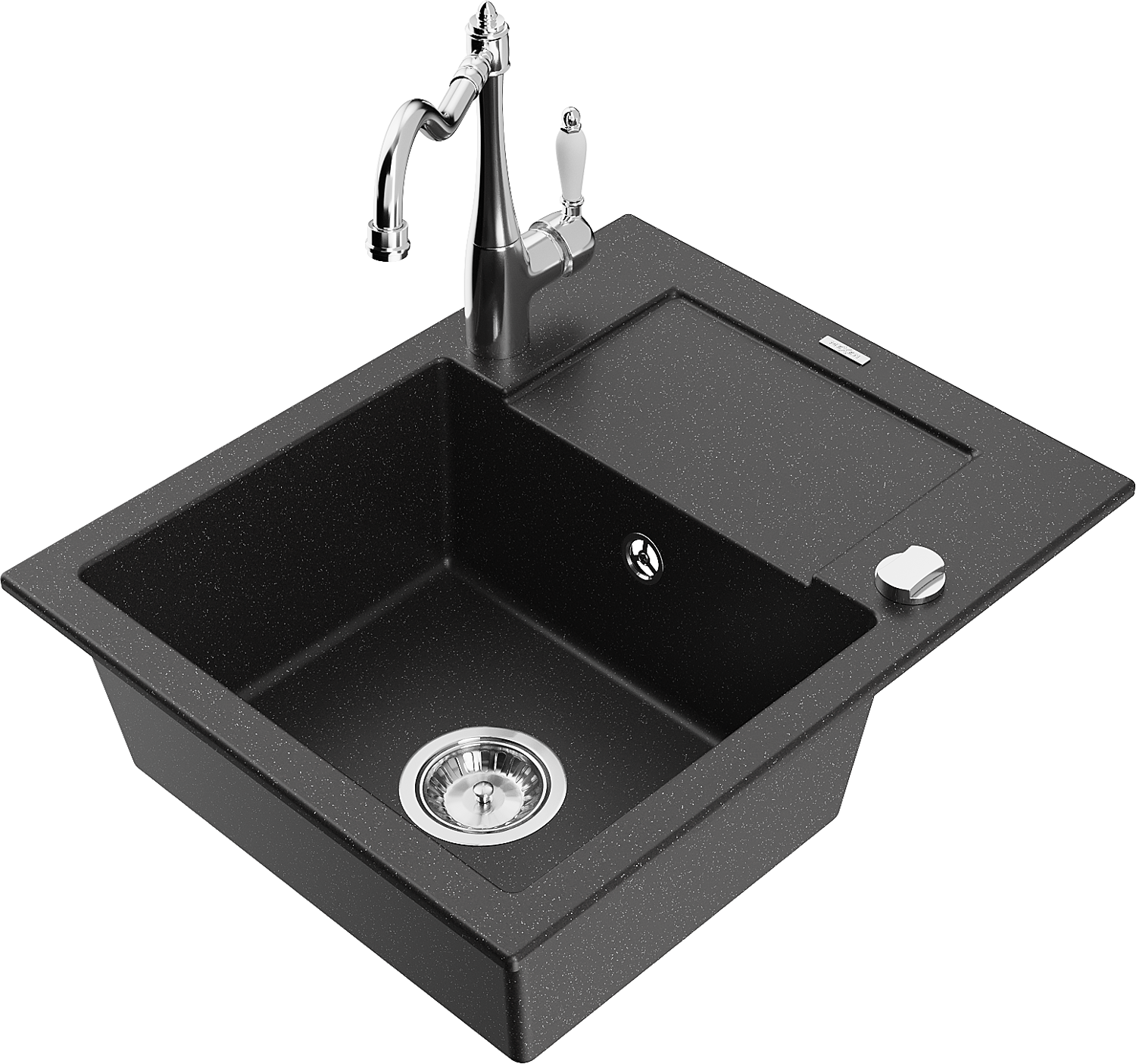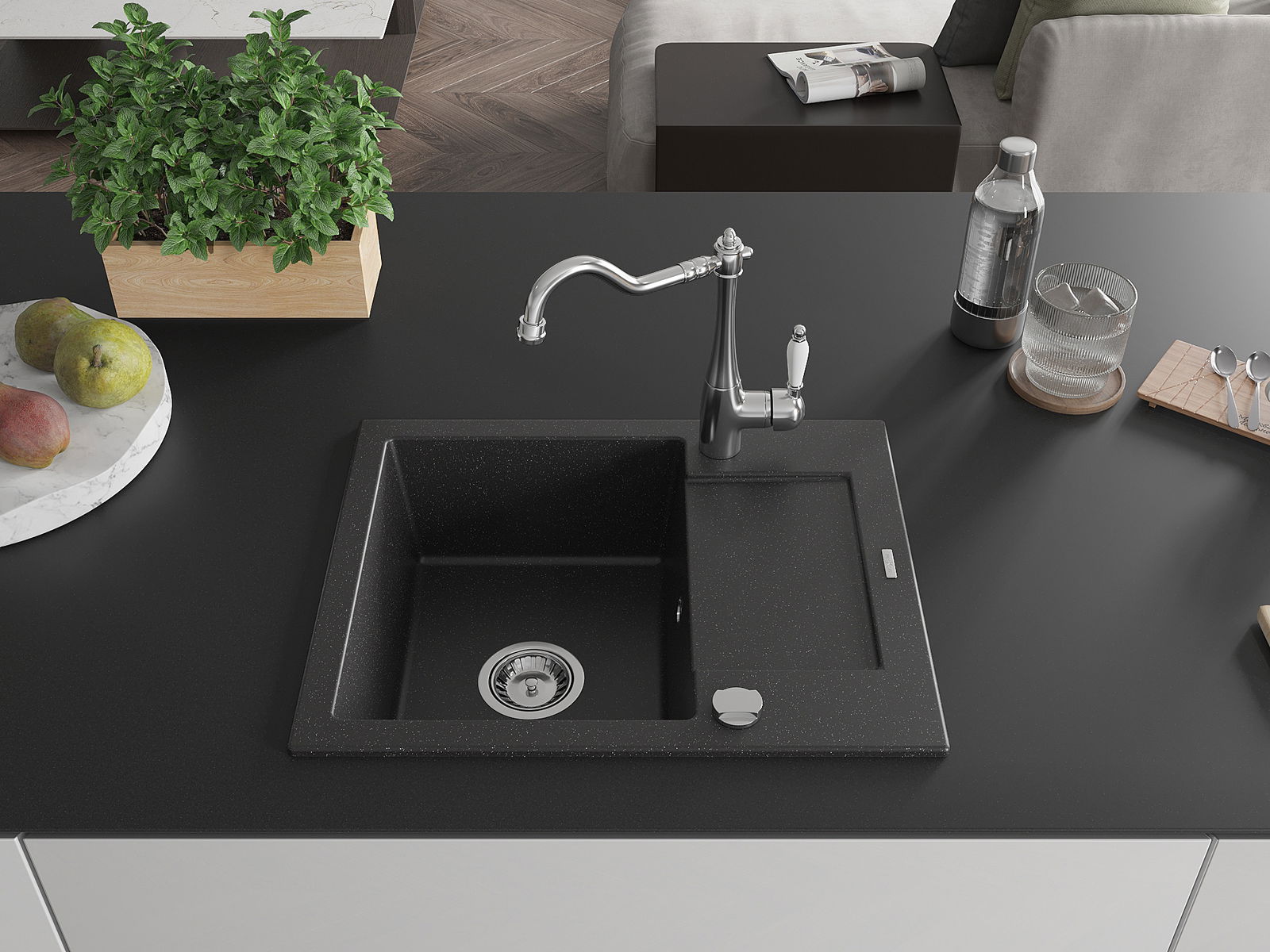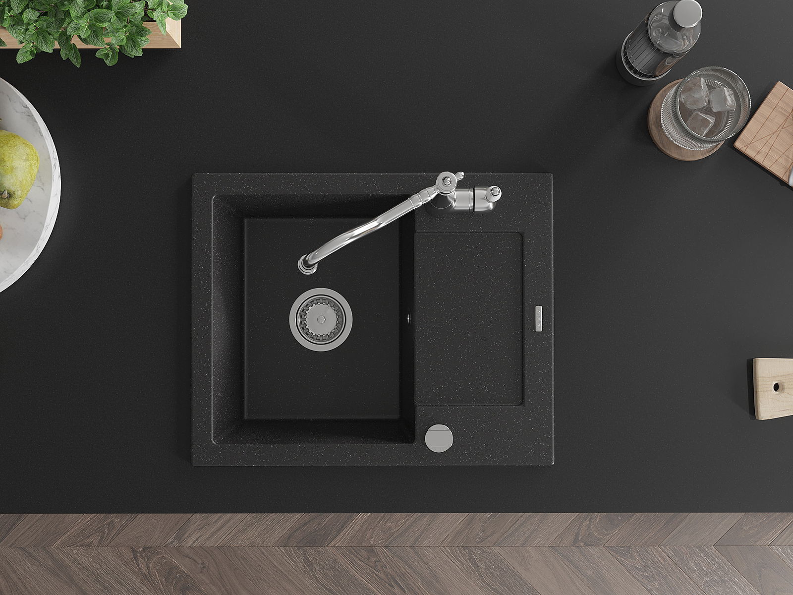 Mexen Enzo granīta izlietne ar vienu nodalījumu un novadkanālu un virtuves jaucējkrānu Carla, melna/sudraba metāliska
