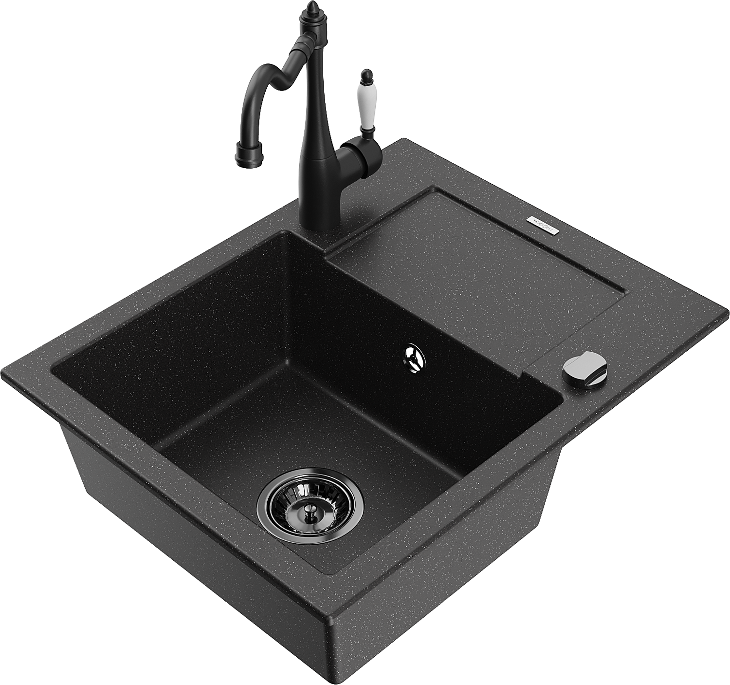 Mexen Enzo grānīta izlietne ar vienu nodalījumu ar noteces paliktni un virtuves jaucējkrānu Carla, melna/sudraba