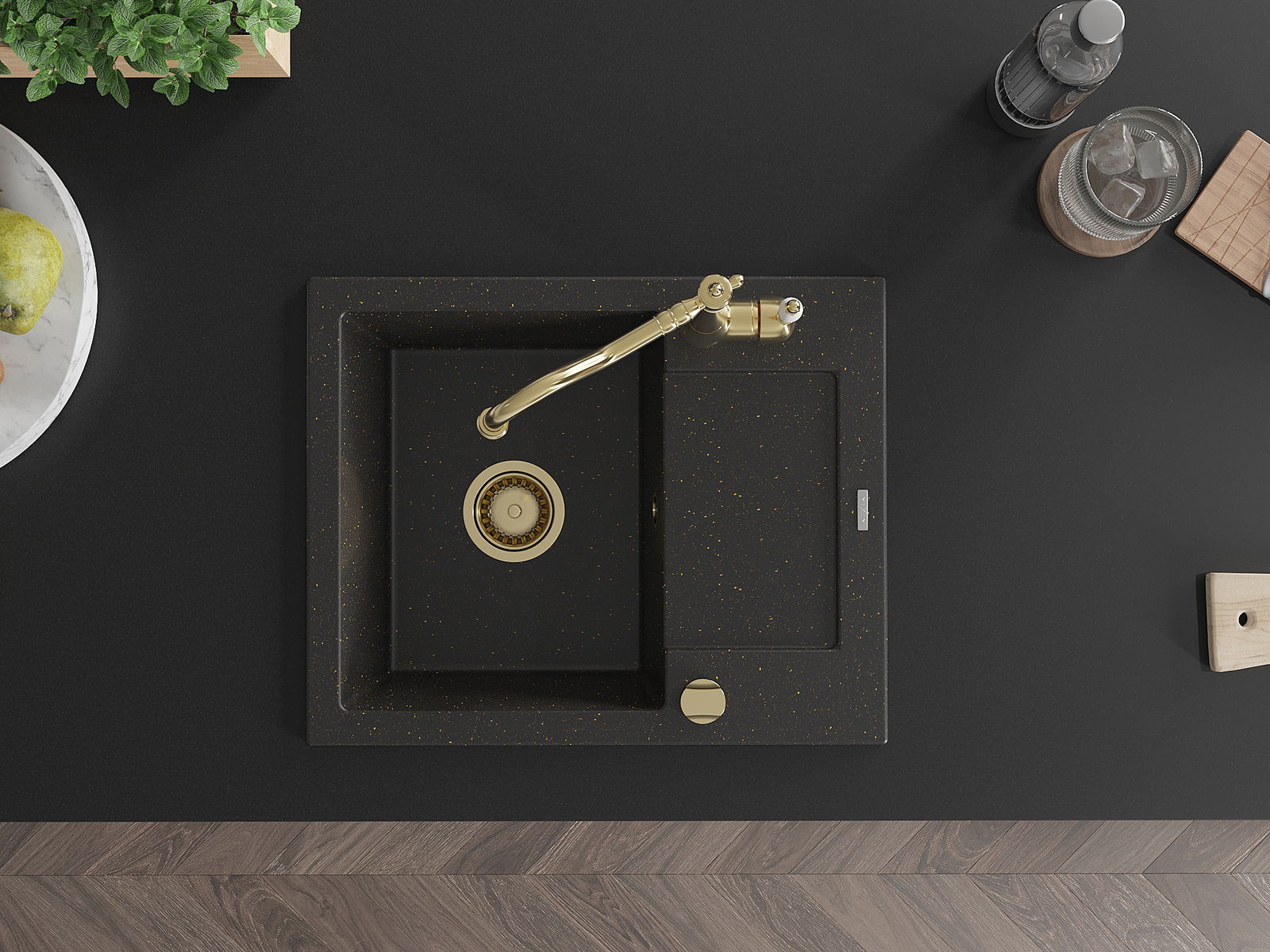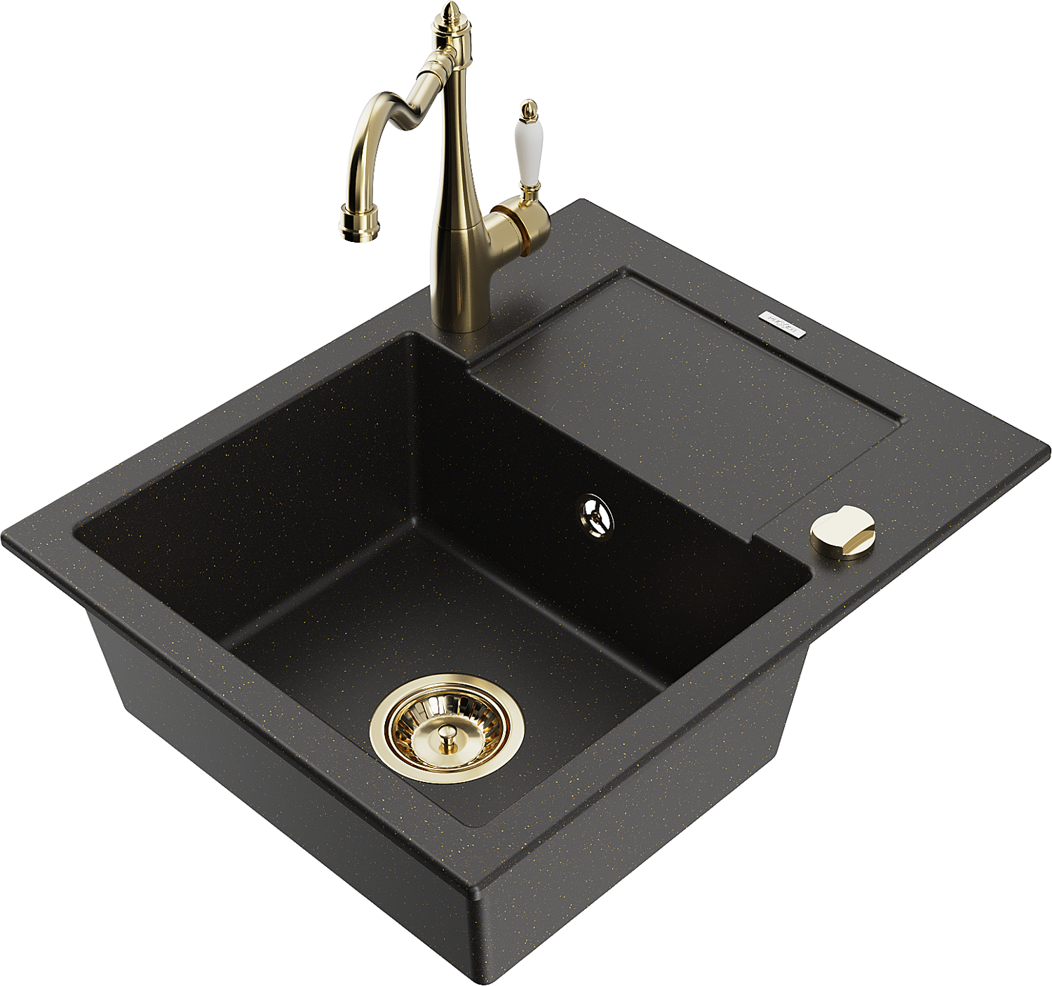 Mexen Enzo granitizlietne 1-nodalījuma ar noteci un virtuves jaucējkrānu Carla, melns/zeltits metāliks - 6506-75-670700-50