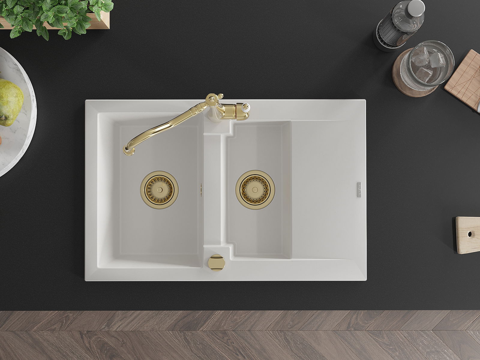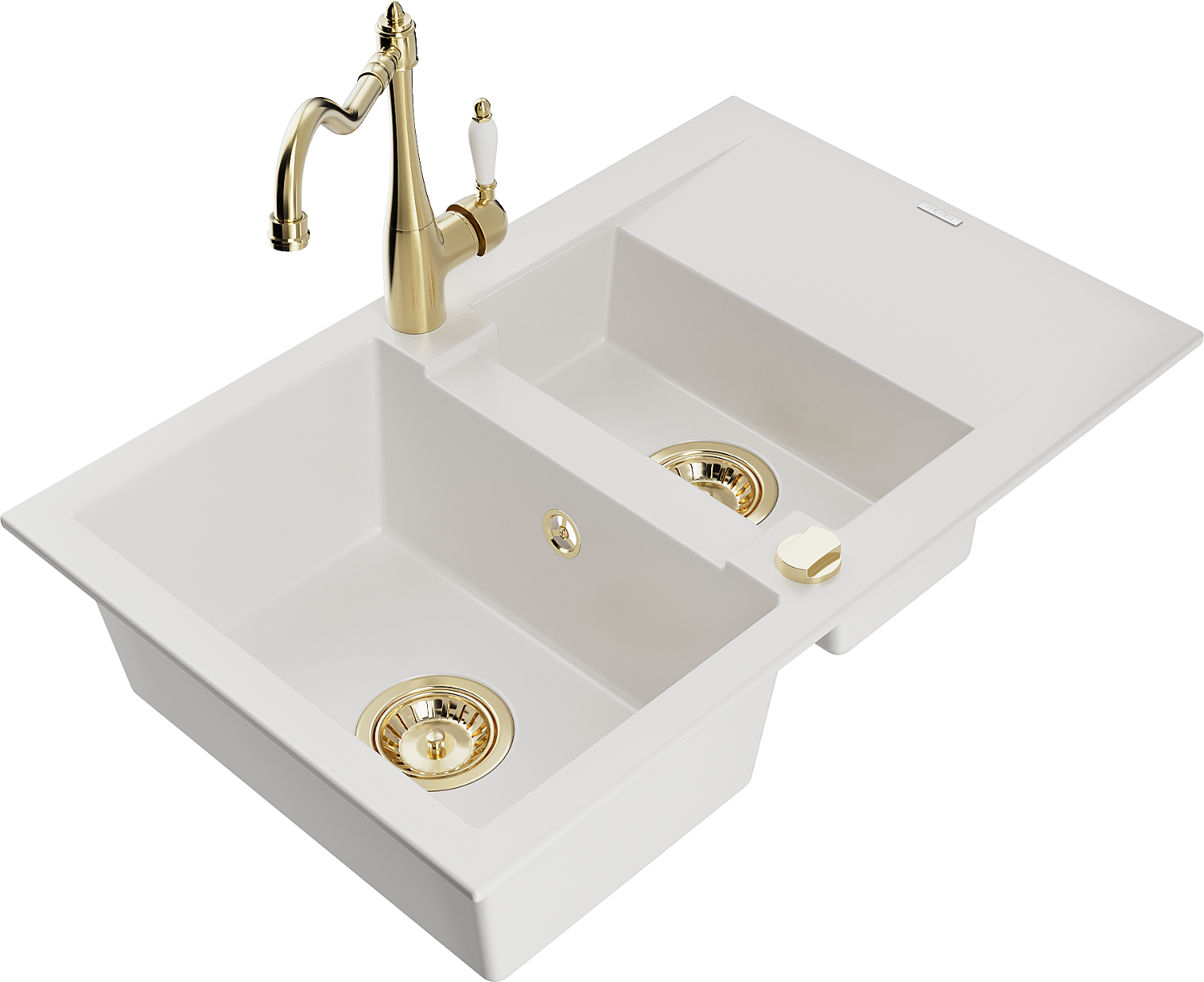 Mexen Gaspar granīta izlietne ar pusi kameru un noteci un virtuves jaucējkrānu Carla, balts - 6507-20-670700-50