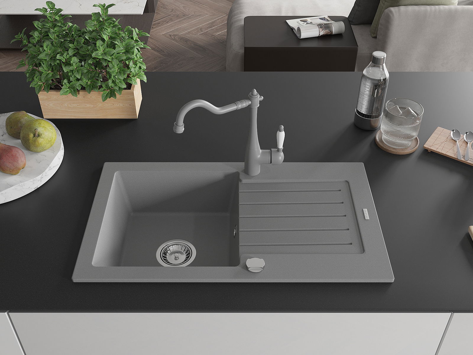 Mexen Pablo granitizlietne 1-kameru ar novadītāju un virtuves jaucējkrānu Carla, pelēks - 6510-71-670700-71