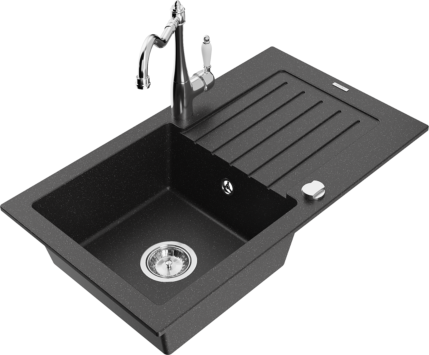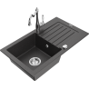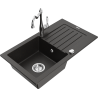Mexen Pablo granīta izlietne ar vienu nodalījumu ar noteces plāksteri un virtuves krānu Carla, melns/sudraba metāliks