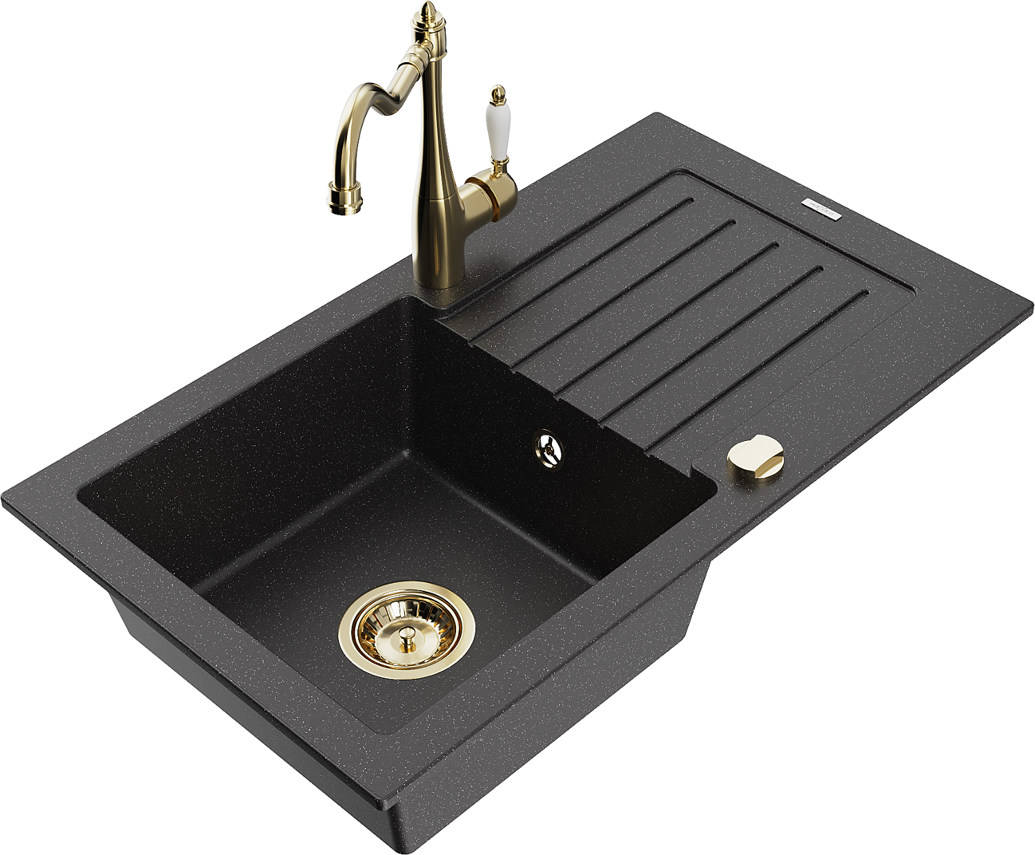 Mexen Pablo granitizlietne 1 nodalījuma ar noteces reni un virtuves jaucējkrānu Carla, melns/sudraba metāliks