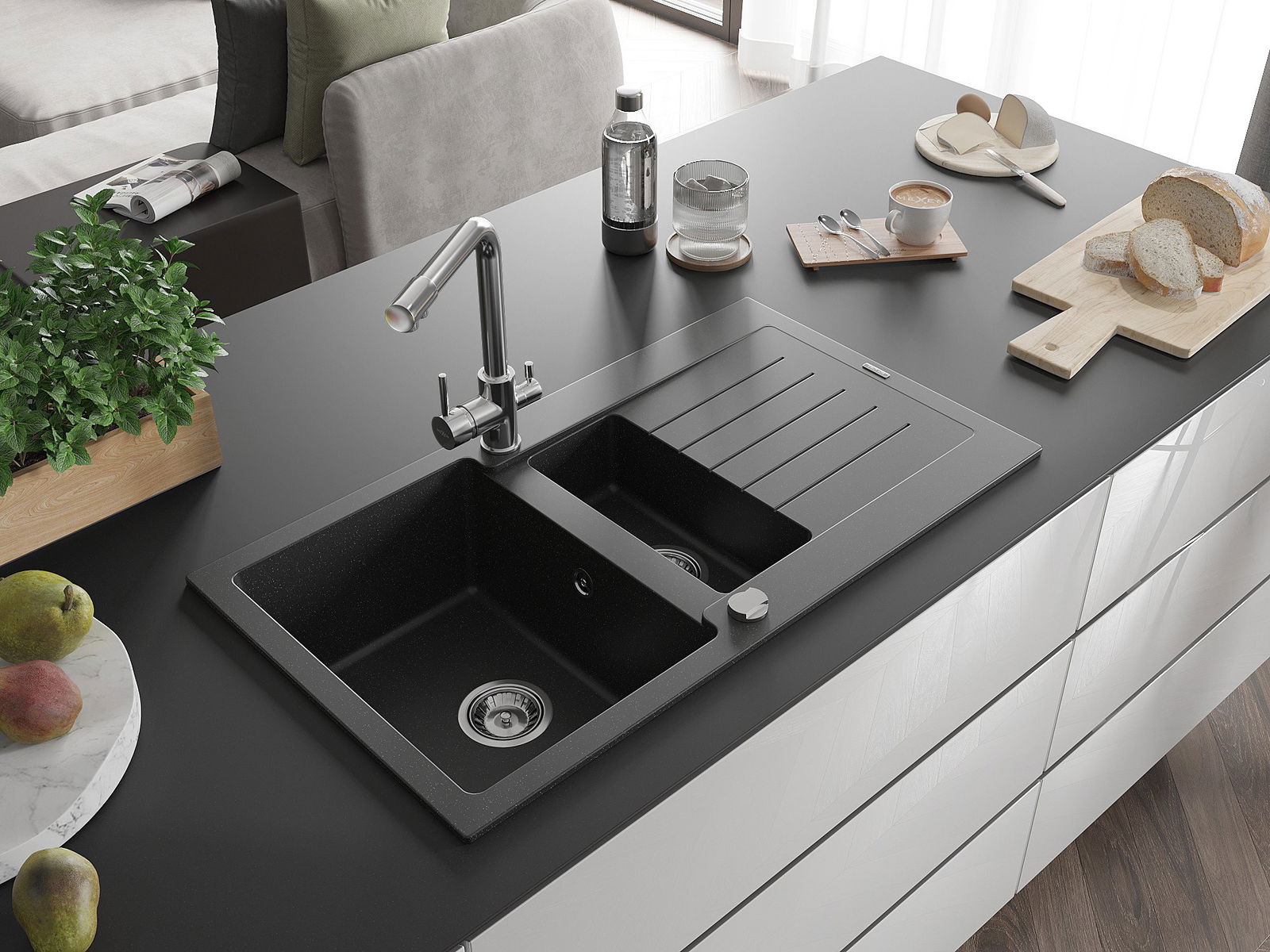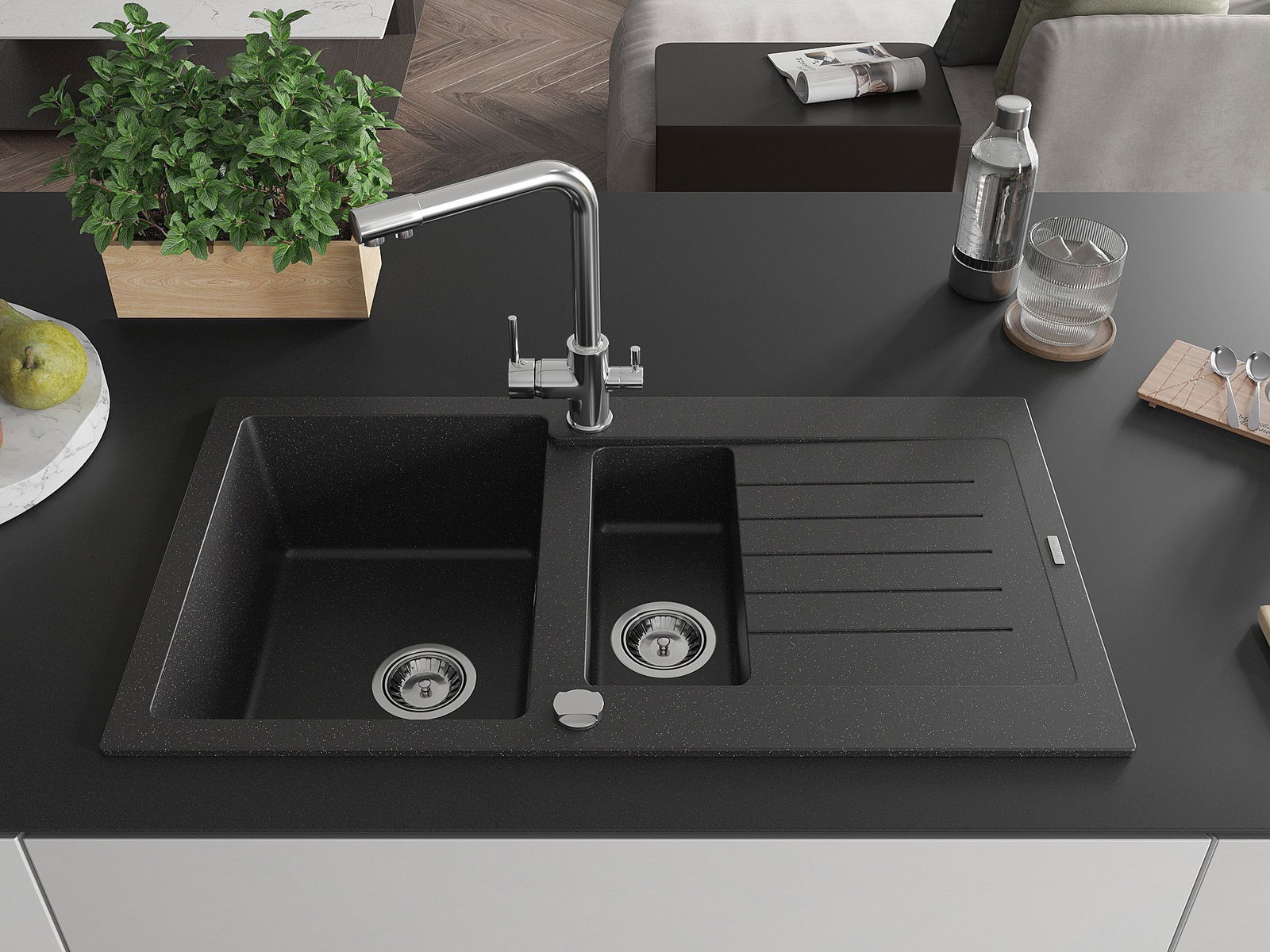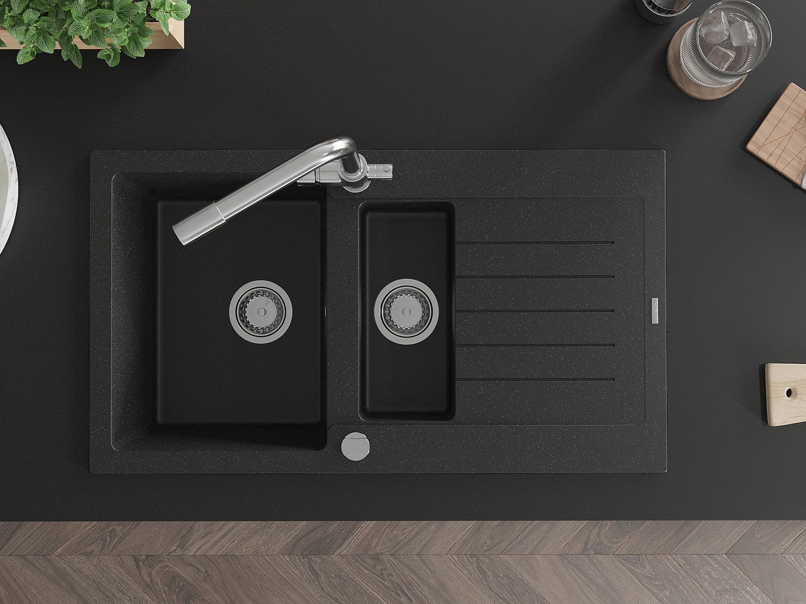 Mexen Matias granitizlietne 1,5 kameru izlietne ar noteku un virtuves jaucējkrānu Duero, melns/sudraba metāliks