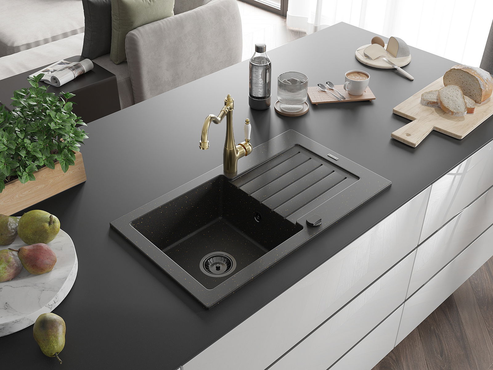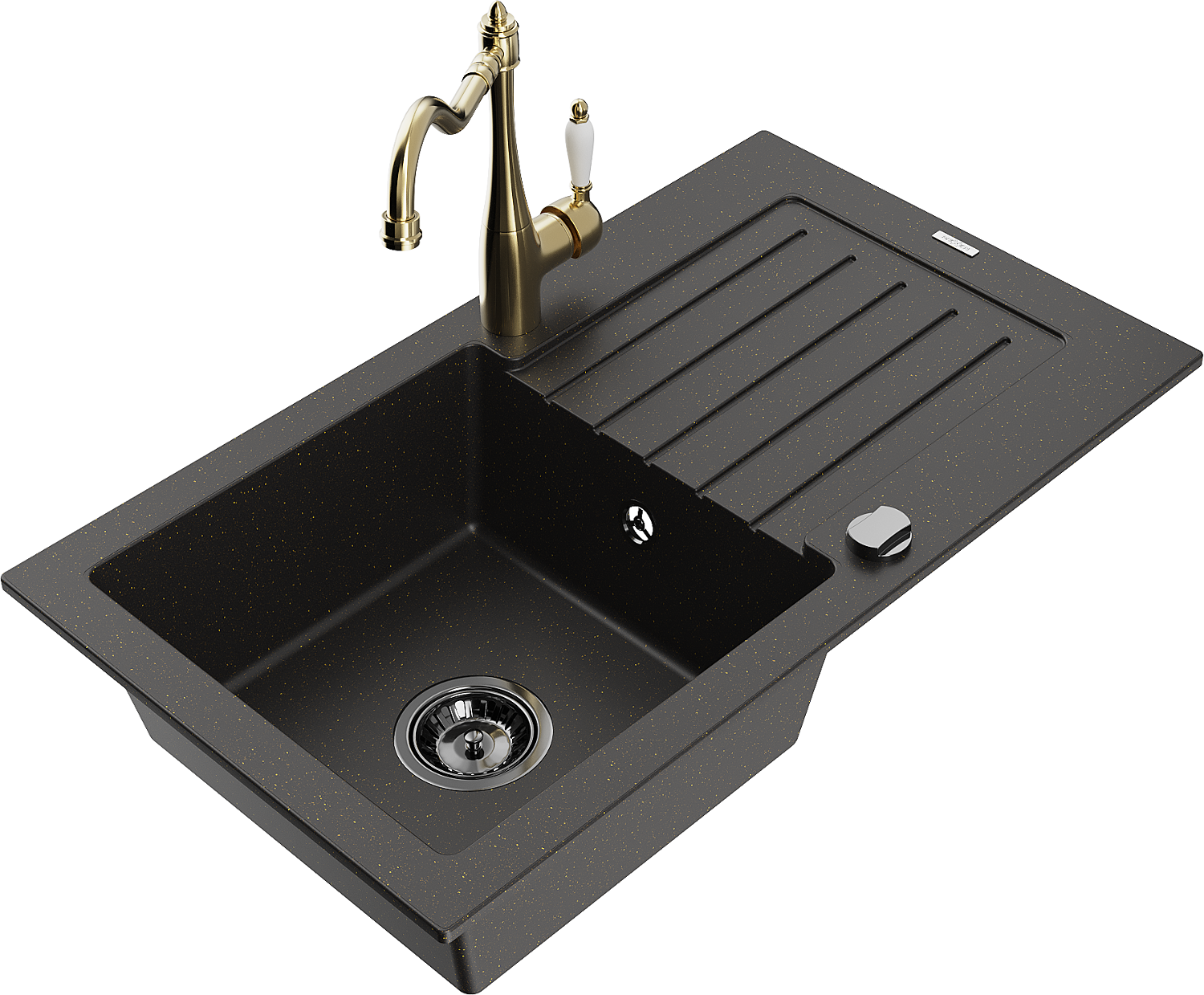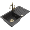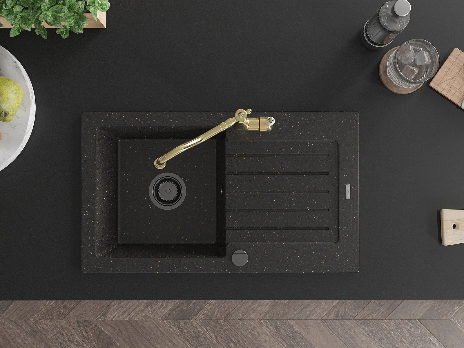 Mexen Pablo grants izlietne ar vienu nodalījumu, noteces un virtuves jaucējkrānu Carla, melns/zeltains metālisks
