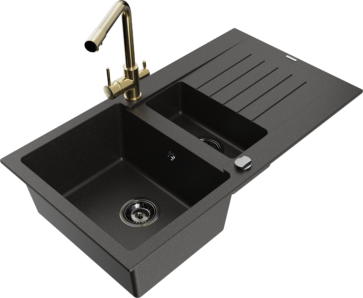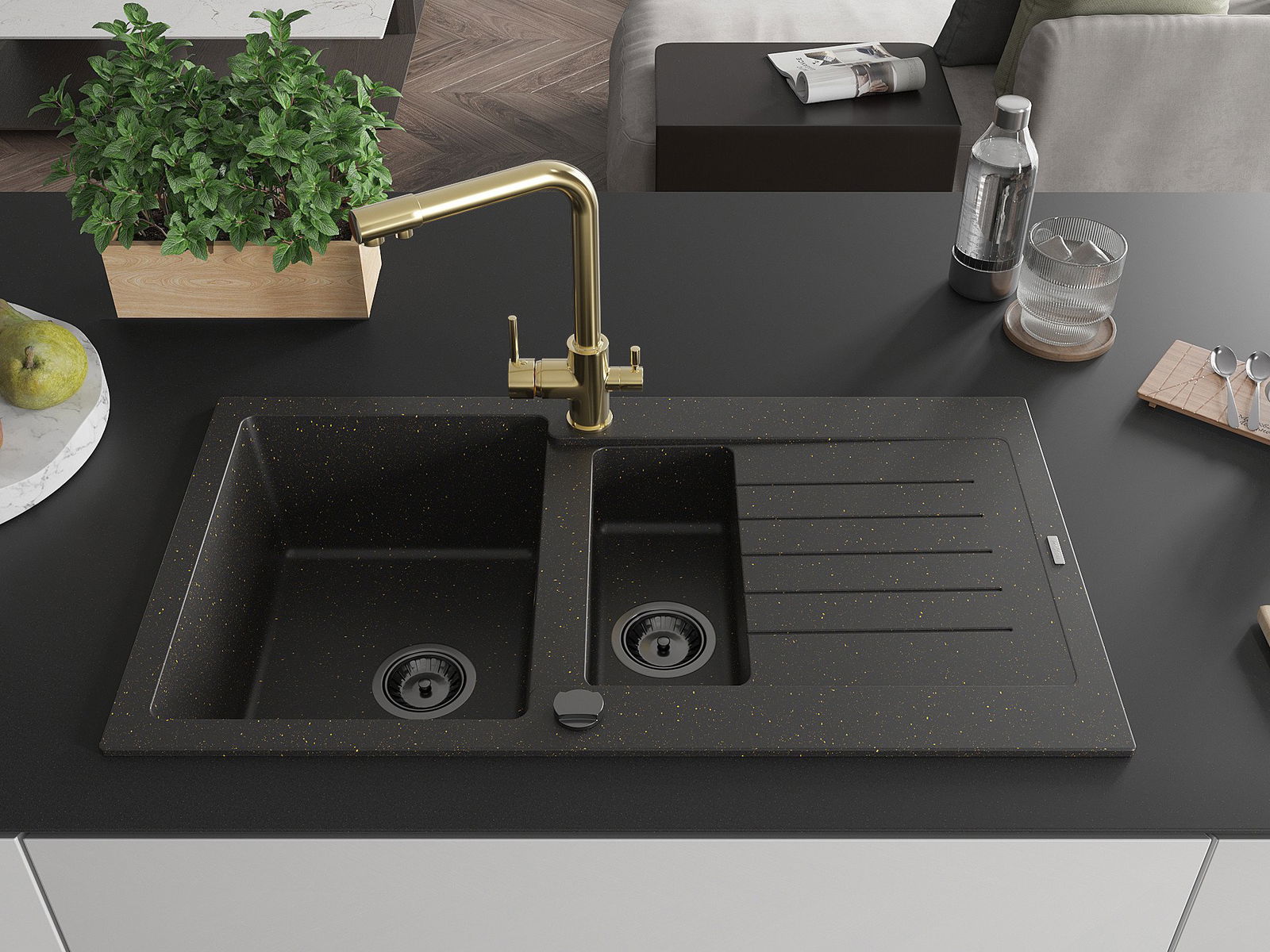 Mexen Matias granīta izlietne 1,5 nodalījumu ar noteku un virtuves jaucējkrānu Duero, melna/zeltīte - 6502-75-671600-50-B