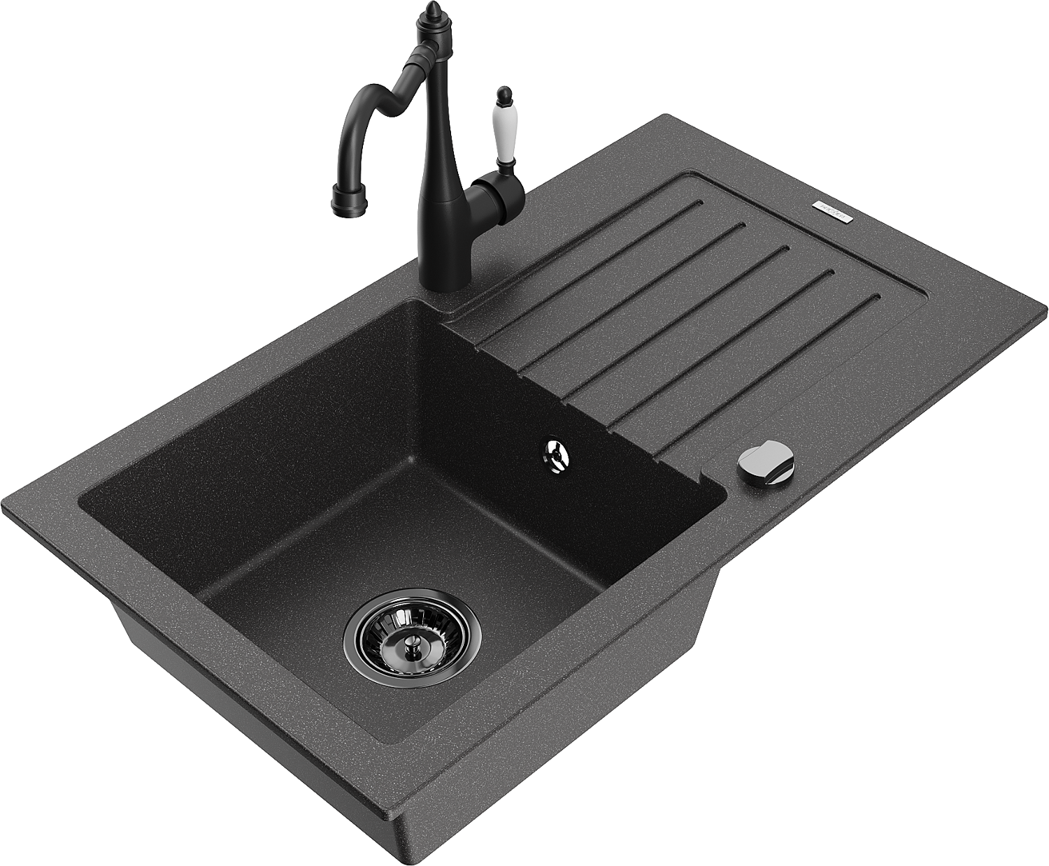 Mexen Pablo granīta izlietne ar vienu nodalījumu un noteces vietu, ar virtuves jaucējkrānu Carla, melna ar punktiem