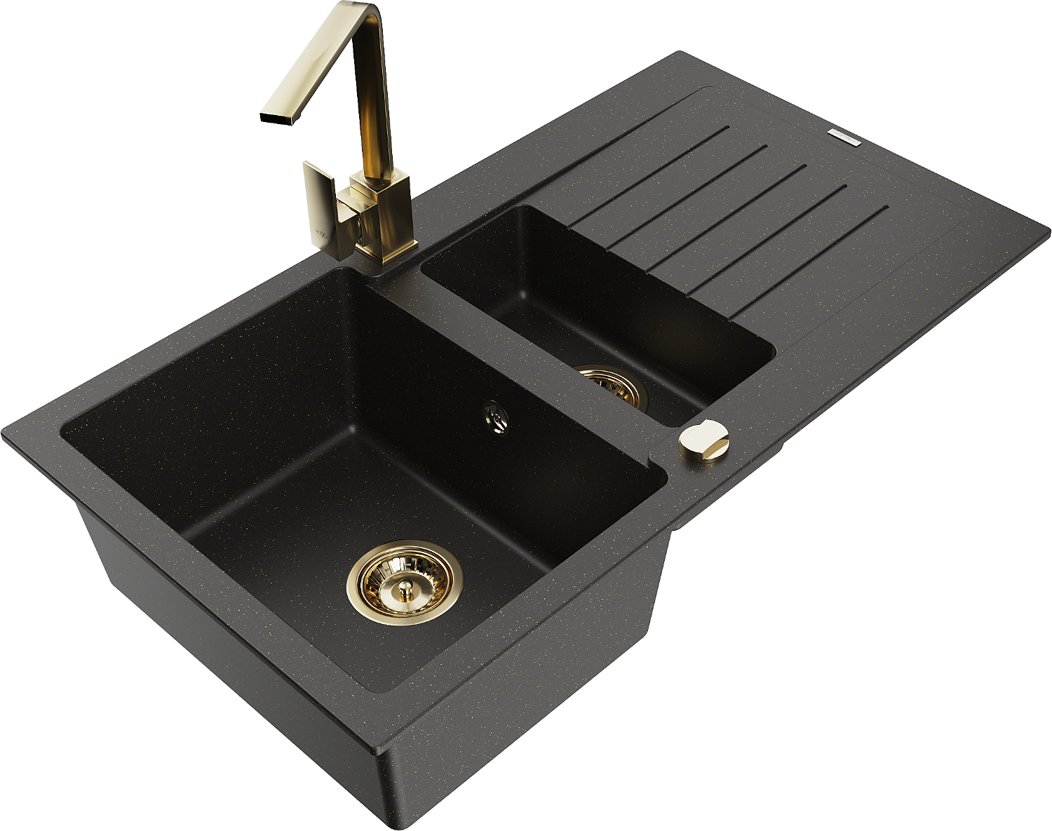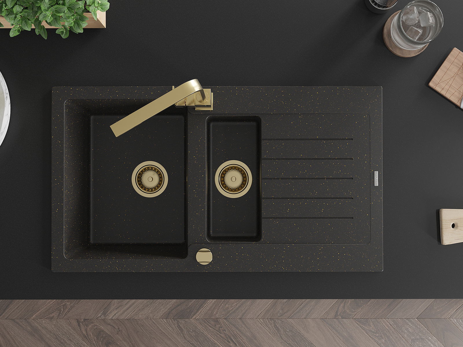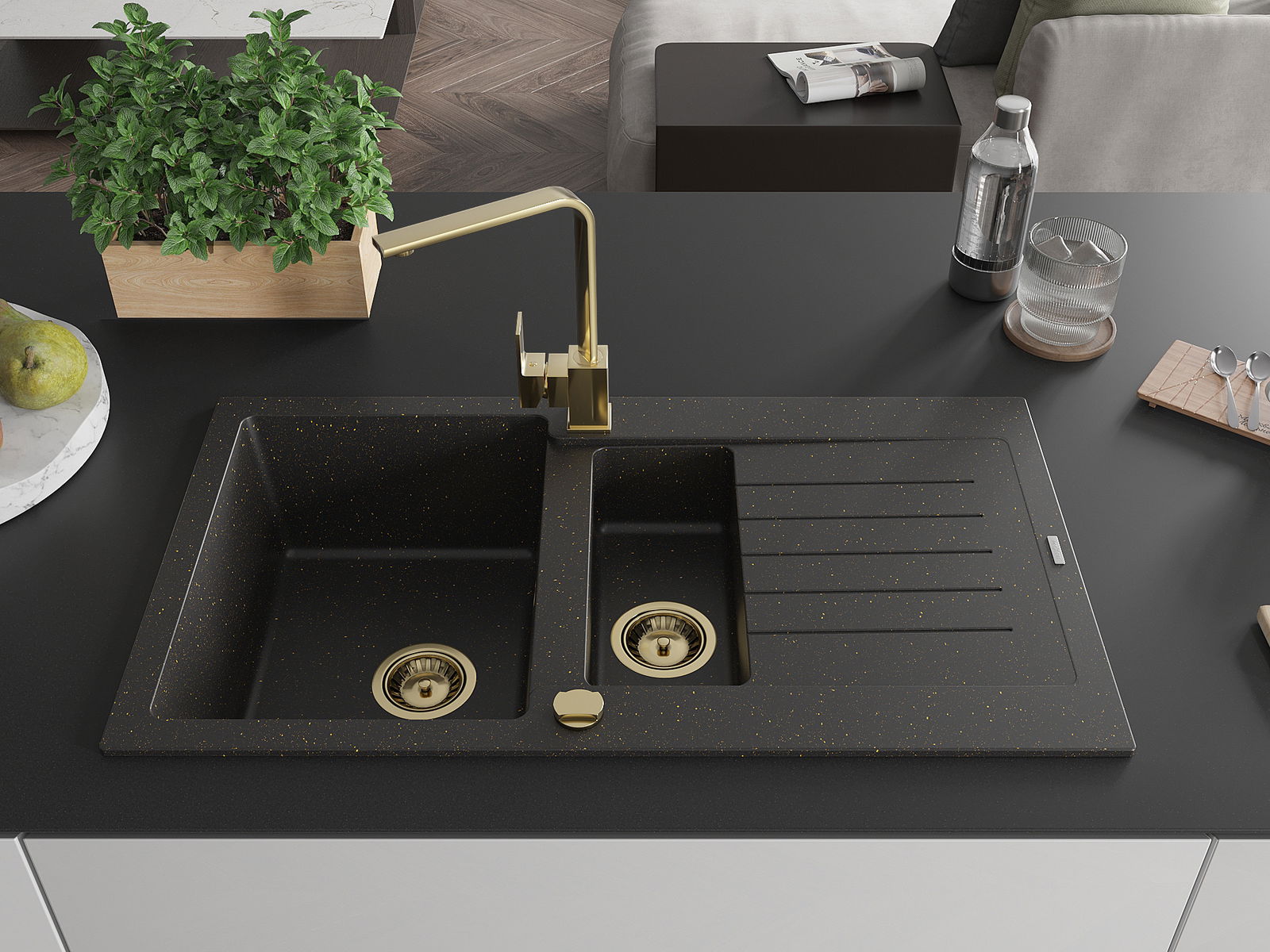 Mexen Matias 1,5 nodalļu granīta izlietne ar notecinātāju un virtuves krānu Rita, melns/zelts - 6502-75-670300-50