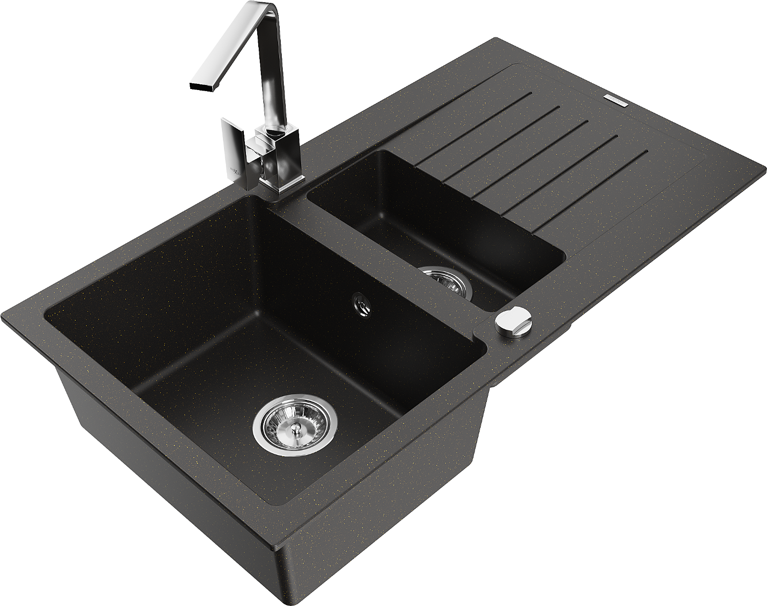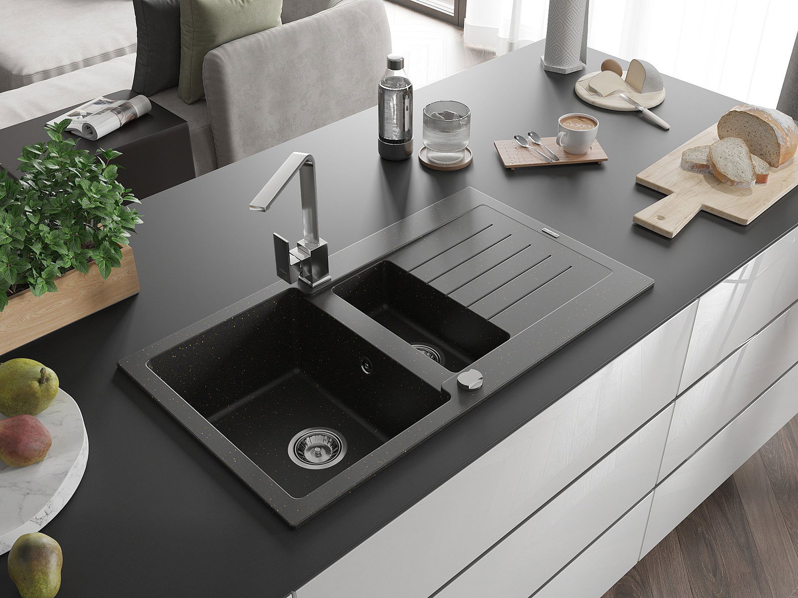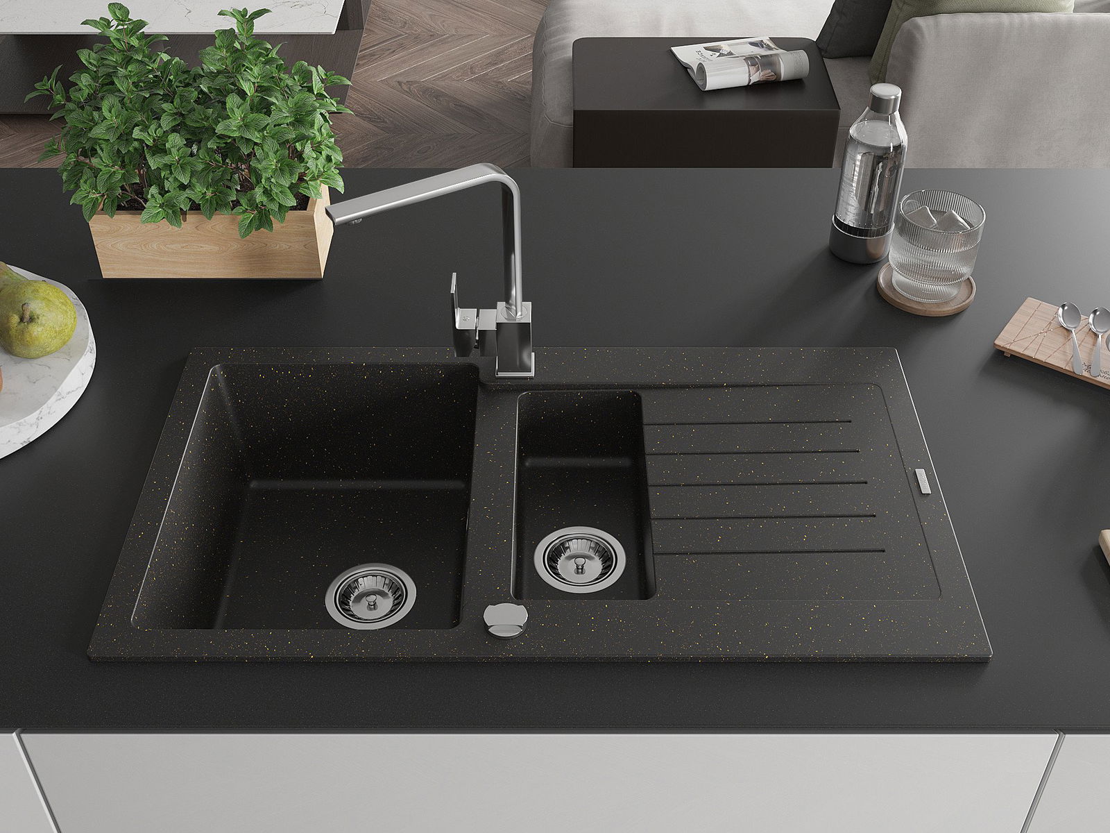 Mexen Matias granīta izlietne ar 1,5 nodalījumiem un notecinātāju, ar virtuves jaucējkrānu Rita, melnā/zelta