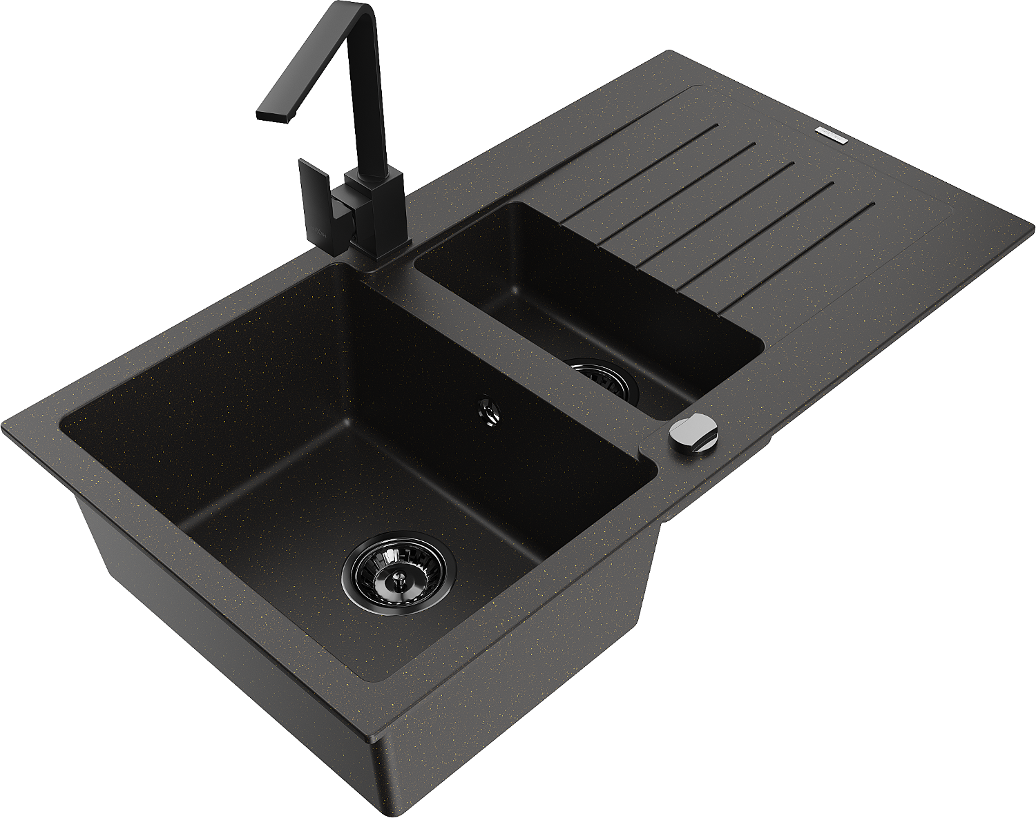 Mexen Matias granitizlietne ar 1,5 nodalījumu, ar noteka un virtuves jaucējkrānu Rita, melna/zeltīta - 6502-75-670300-70-B