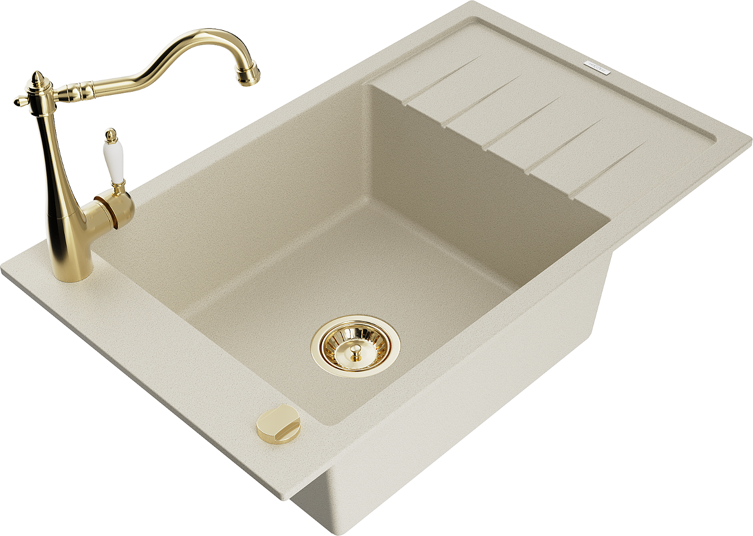Mexen Elias granitizlietne ar vienu nodalījumu ar notecētāju un virtuves jaucējkrānu Carla, bēšs - 6511-69-670700-50