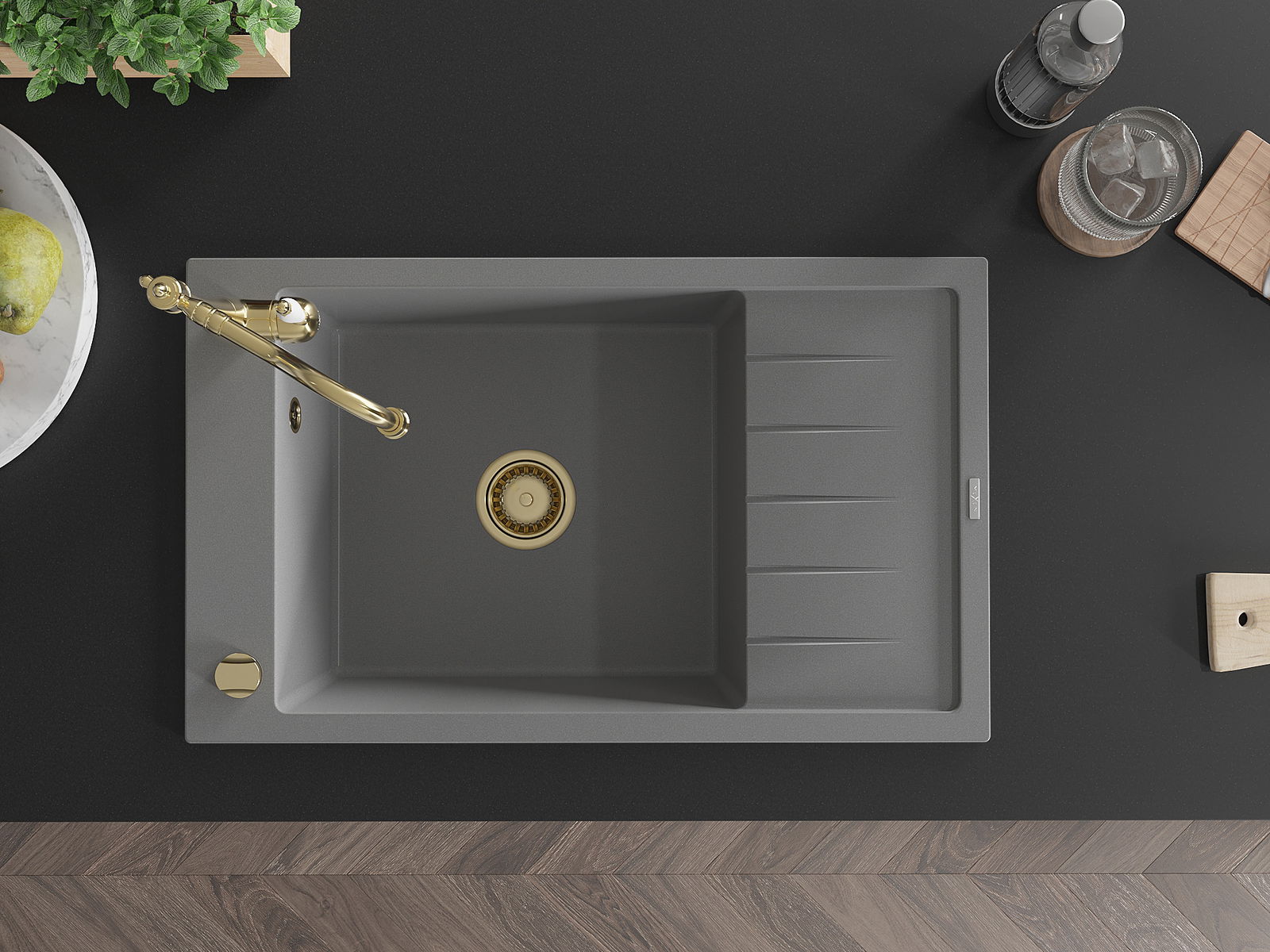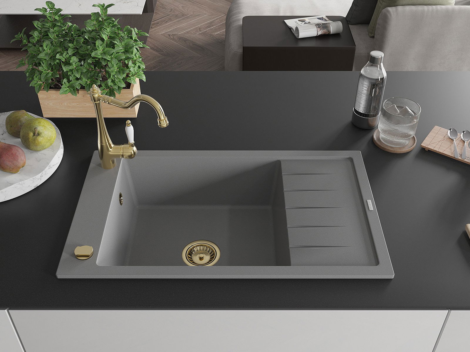 Mexen Elias vienas nodalījuma granīta izlietne ar noteces plauktu un virtuves jaucējkrānu Carla, pelēka - 6511-71-670700-50