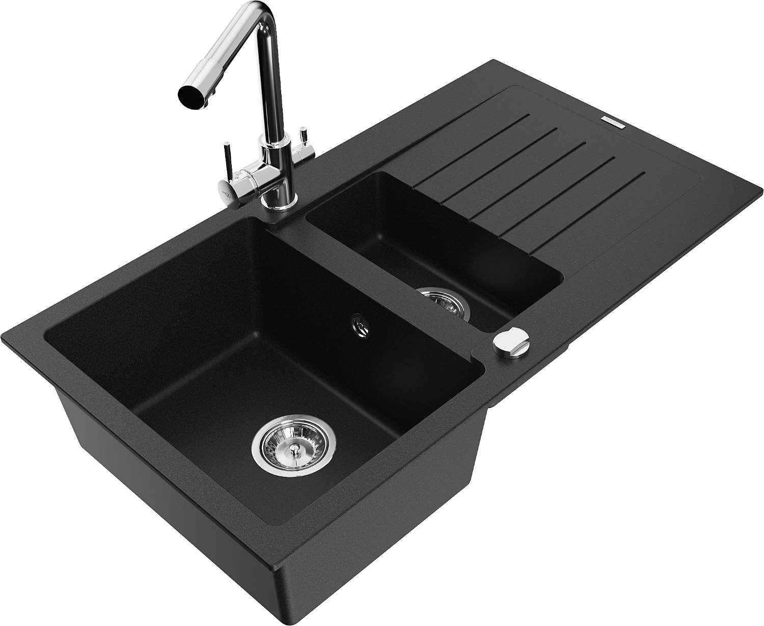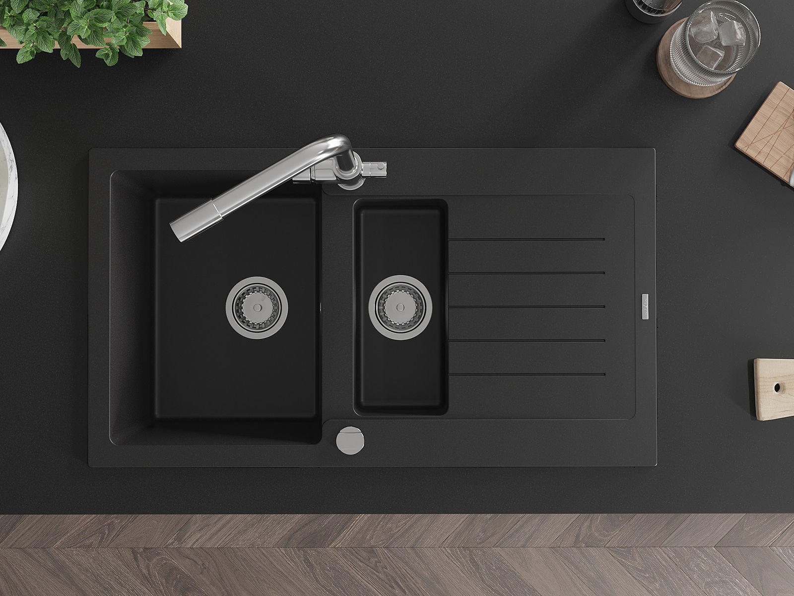 Mexen Matias granitāts izlietne ar 1,5 nodalījumiem, notekpaplāti un virtuves krānu Duero, melns - 6502-77-671600-00
