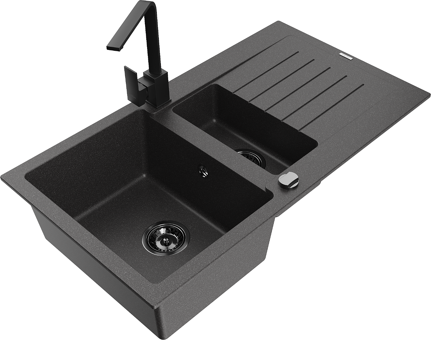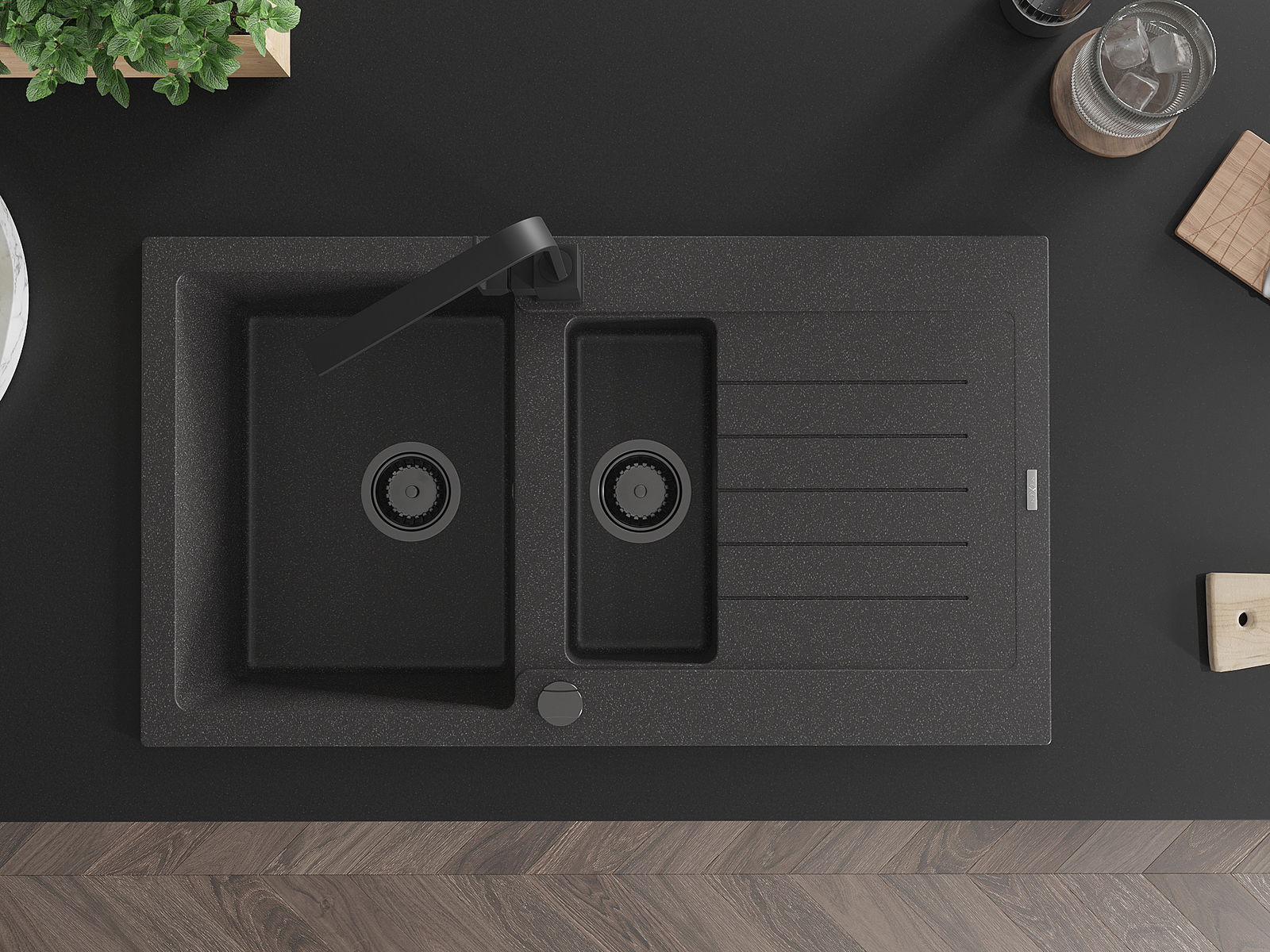 Mexen Matias granitizlietne izlietne ar 1,5 nodalījumu ar noteci un virtuves jaucējkrānu Rita, melns ar plankumiem