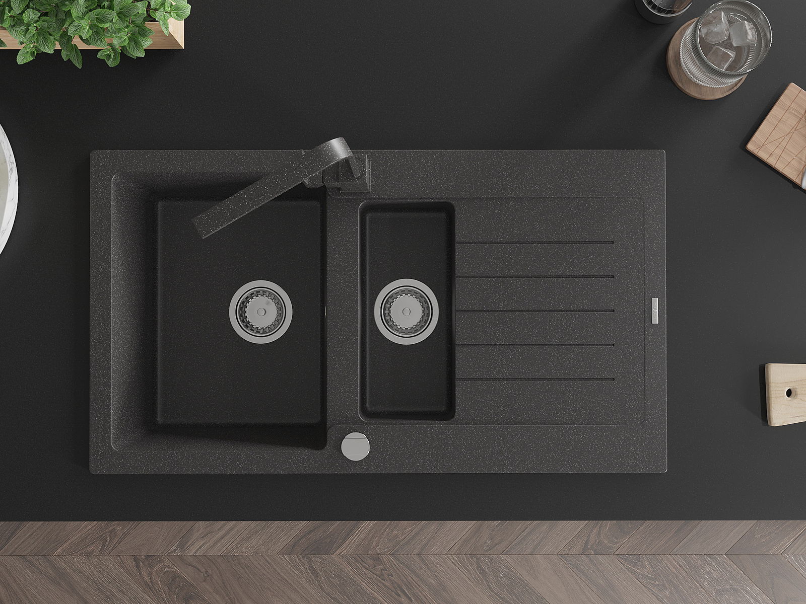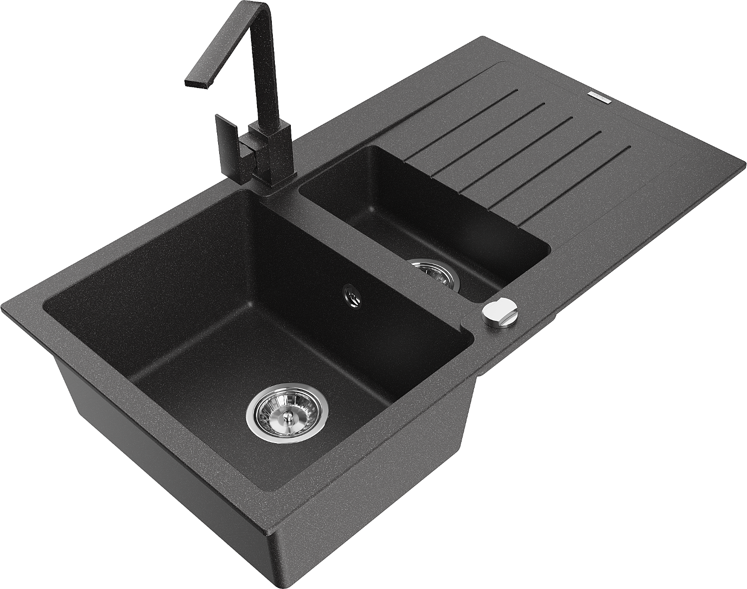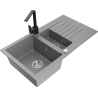 Mexen Matias granīta izlietne ar 1,5 nodalījumiem, notecētu un Rita virtuves jaucējkrānu, melns ar plankumiem