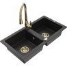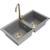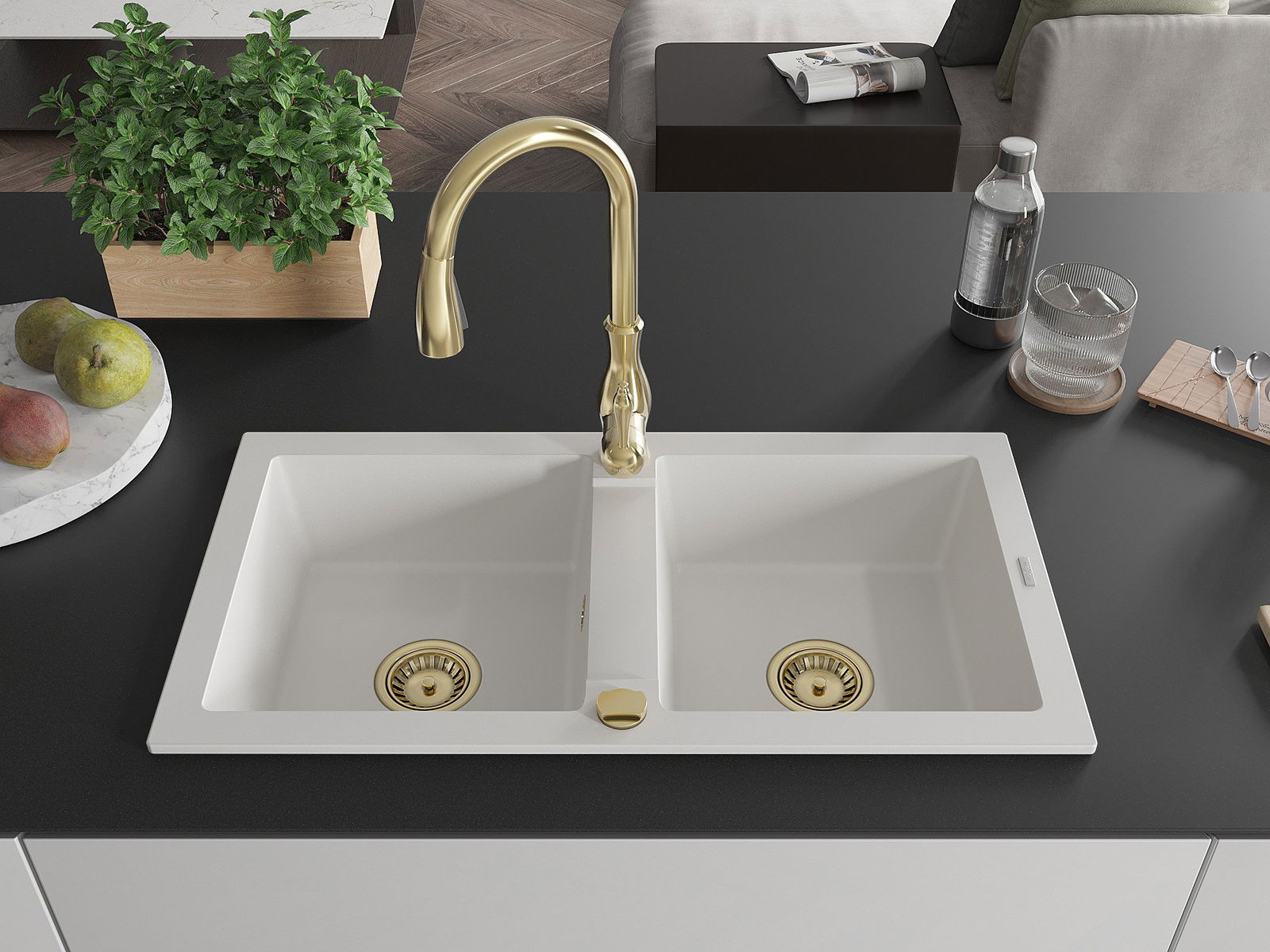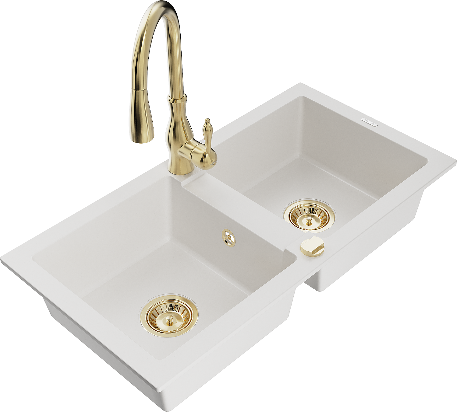 Mexen Mario granitā izlietne ar divām kamerām un virtuves jaucējkrānu Savita, balta - 6504-20-672601-50