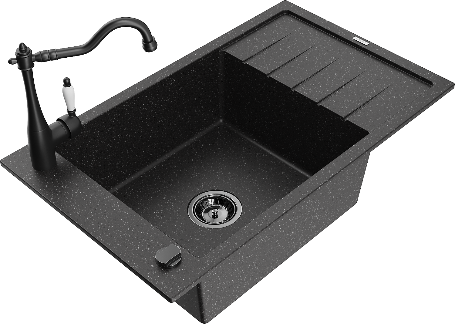 Mexen Elias granitizlietne viena nodalījuma ar notecēšanas zonu un virtuves jaucējkrāns Carla, melns/sudraba metāliks