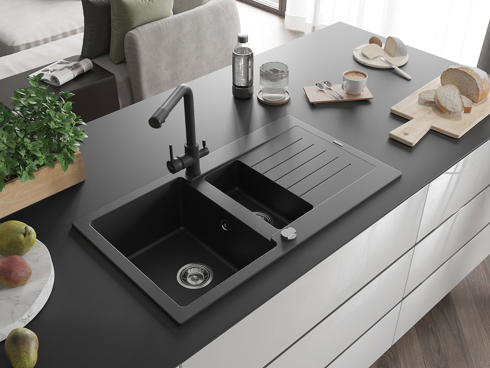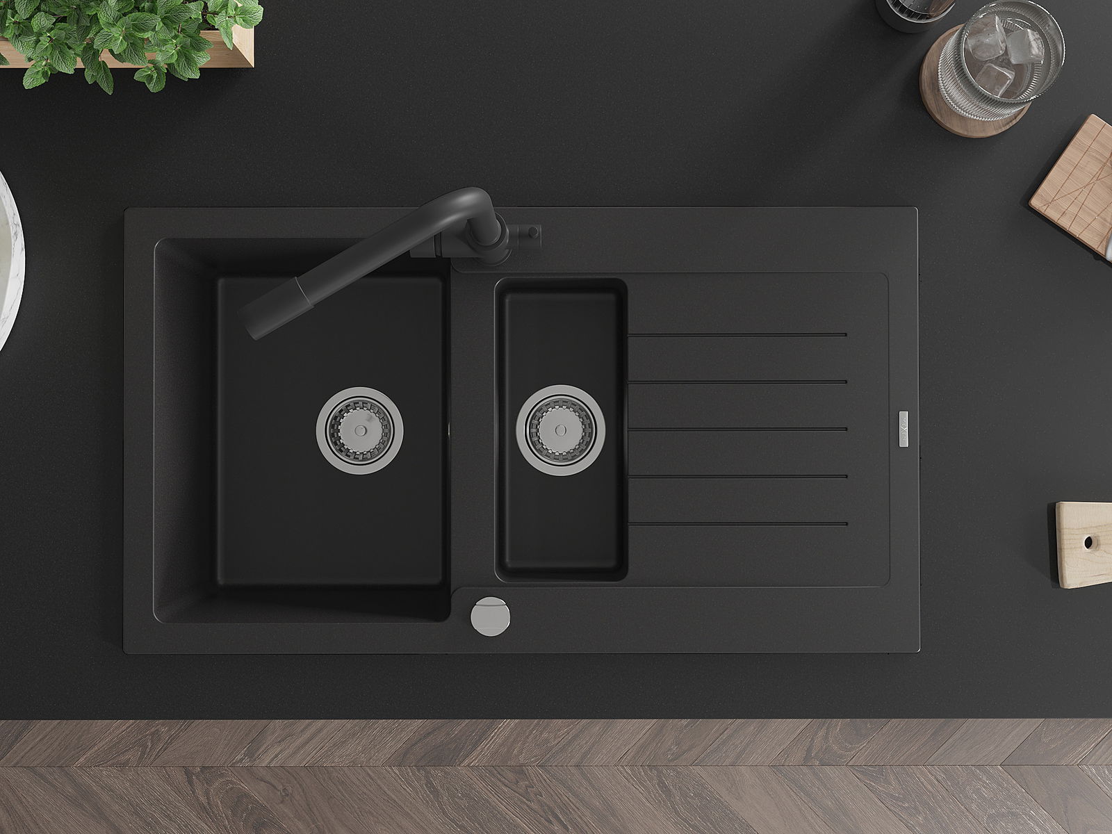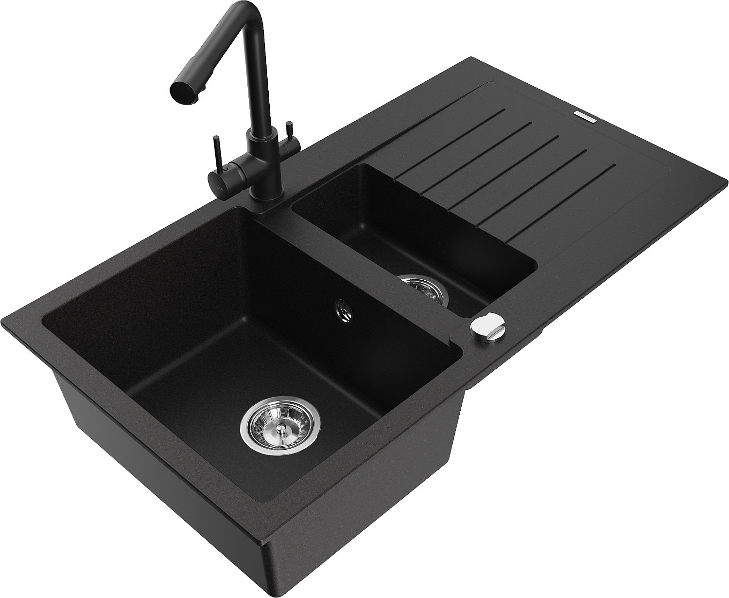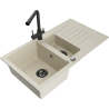 Mexen Matias granīta izlietne ar 1,5 nodalījumiem ar notekpaplāti un virtuves jaucējkrānu Duero, melna - 6502-77-671600-70