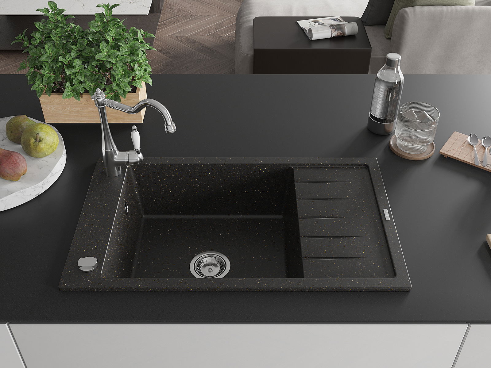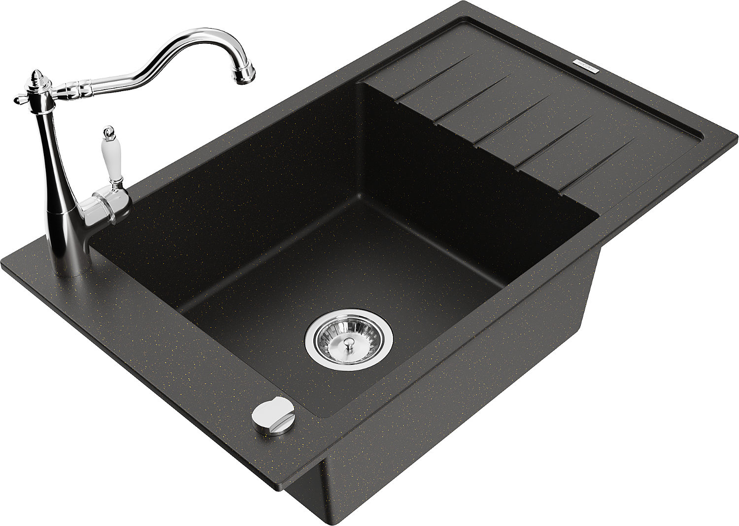Mexen Elias granitizlietne 1 sekcijas ar notekas un virtuves jaucējkrānu Carla, melns/zelta metāliskais - 6511-75-670700-00