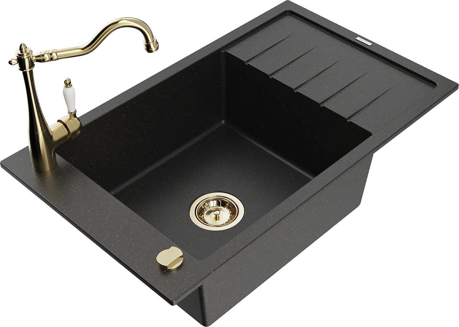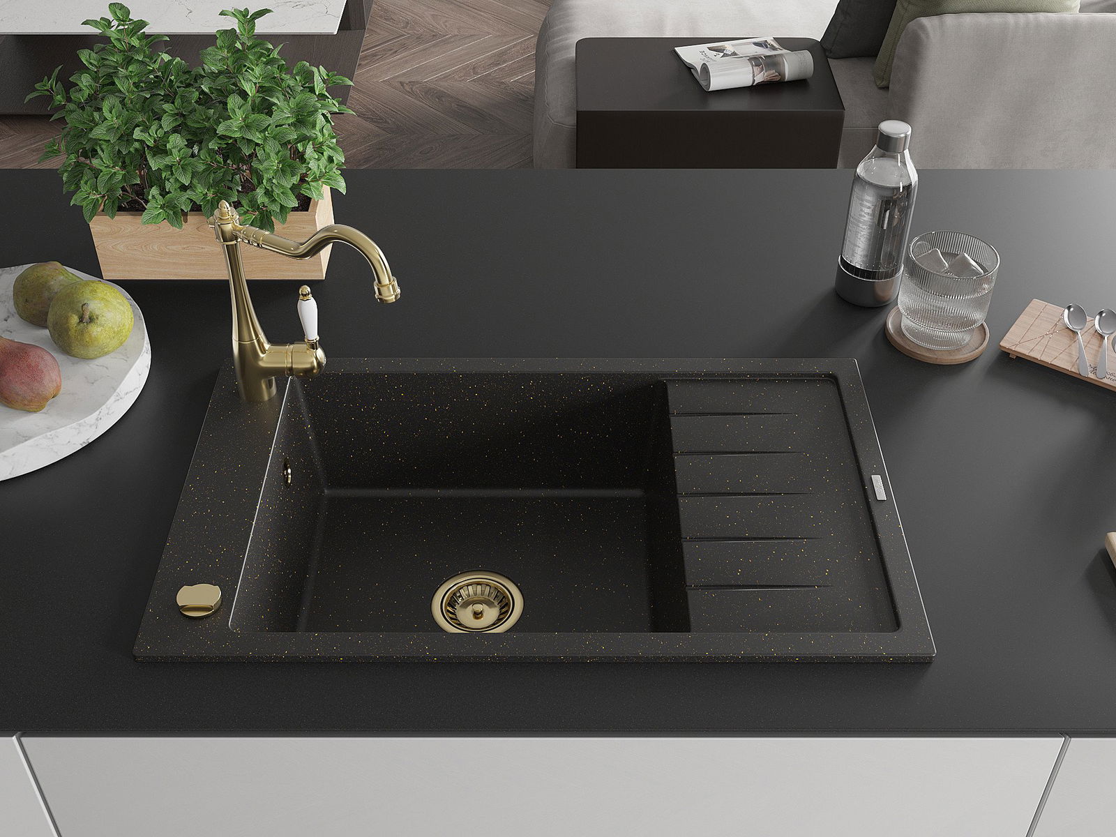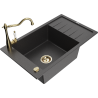 Mexen Elias granitā izlietne ar 1 nodalījumu un notekas un virtuves krānu Carla, melna/zeltīta metālika - 6511-75-670700-50