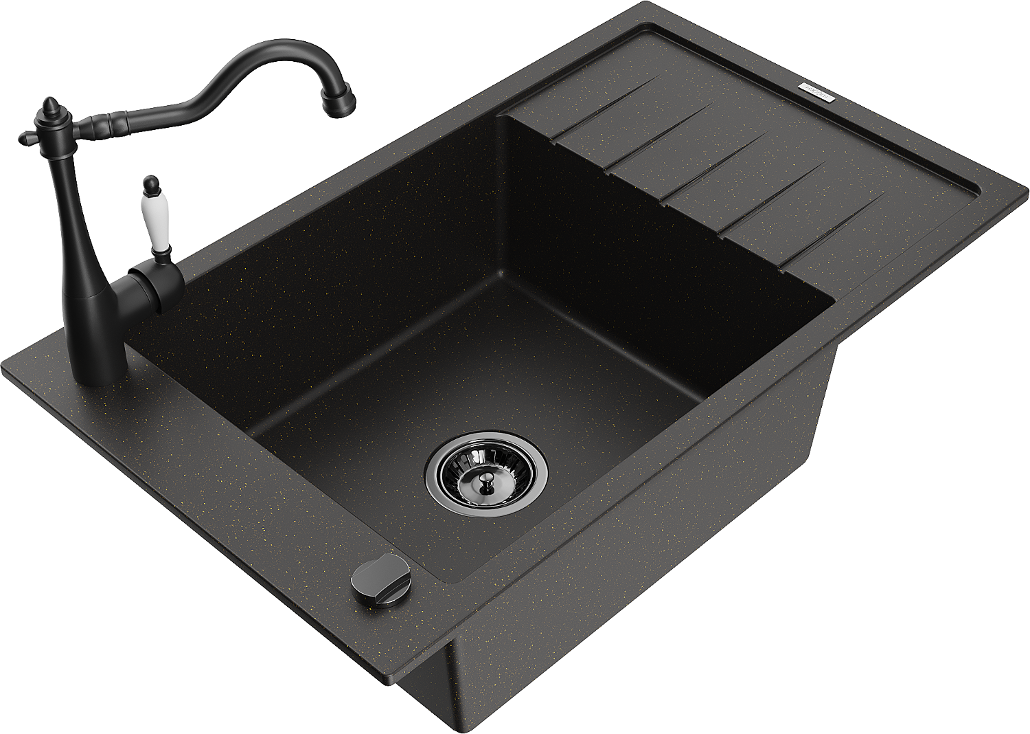 Mexen Elias grāmatveida granīta izlietne ar 1 nodalījumu ar noteces un virtuves krānu Carla, melns/zeltains metālisks