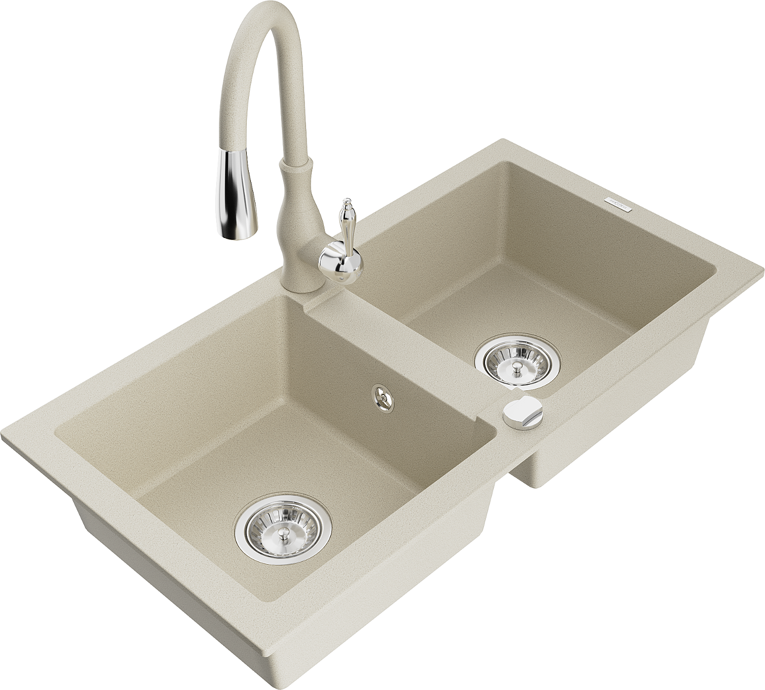 Mexen Mario granitais virtuves izlietne ar 2 nodalījumiem un Savita krānu, bēšā krāsā - 6504-69-672601-69