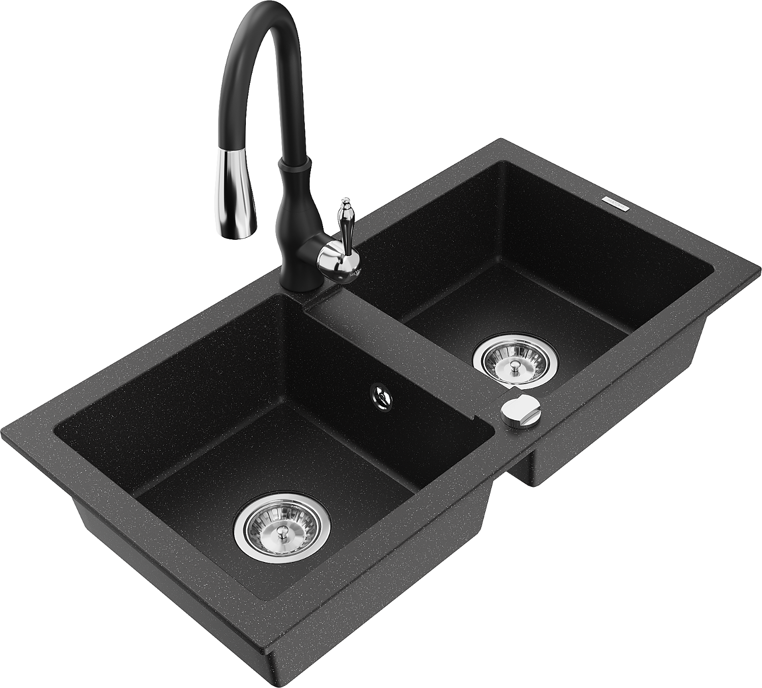 Mexen Mario granīta divdaļīgs izlietne ar virtuves jaucējkrānu Savita, melna/sudraba metāliks - 6504-73-672601-70