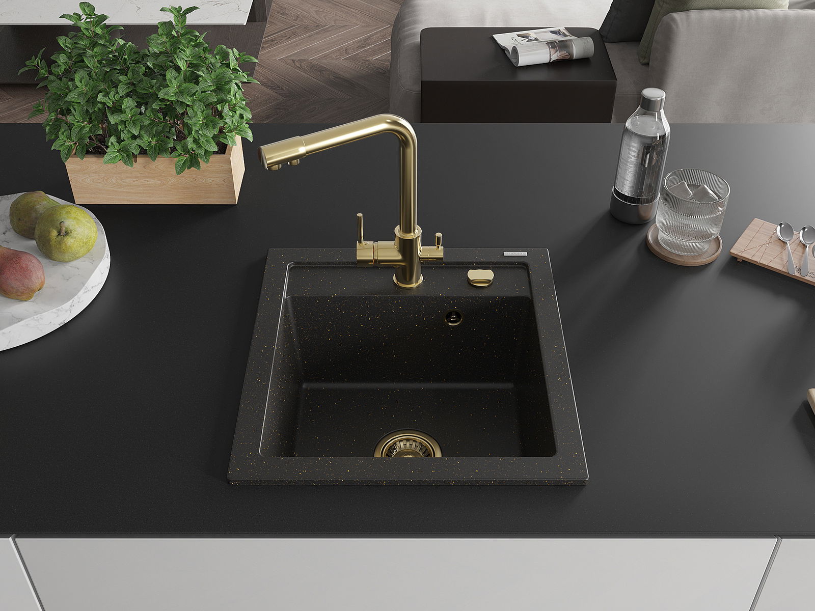 Mexen Vito vienas pagarināts granīta izlietne ar virtuves jaucējkrānu Duero, melna/zeltīts metāliska - 6503-75-671600-50