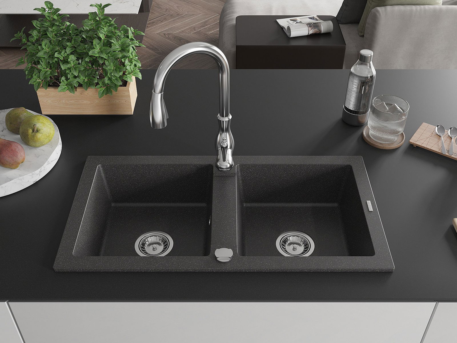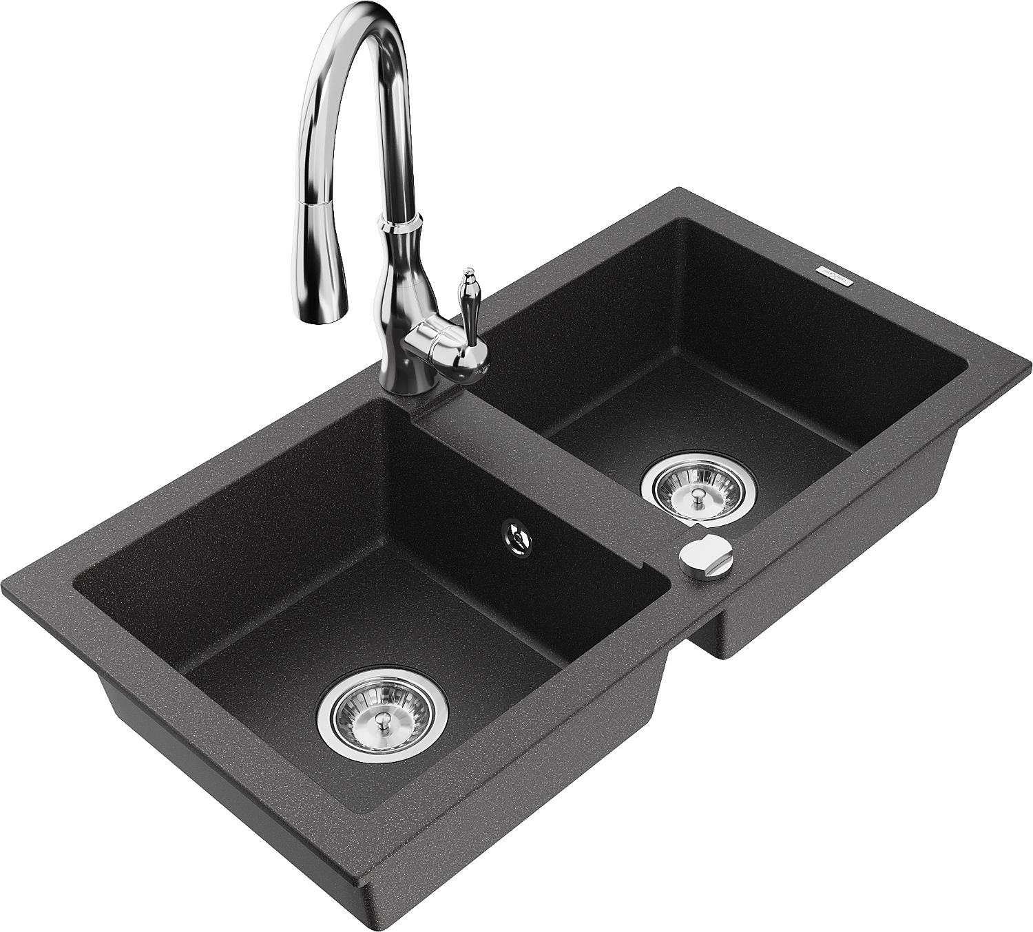 Mexen Mario granitizlietne ar 2 nodalījumiem un virtuves jaucējkrānu Savita, melns pumpains - 6504-76-672601-00