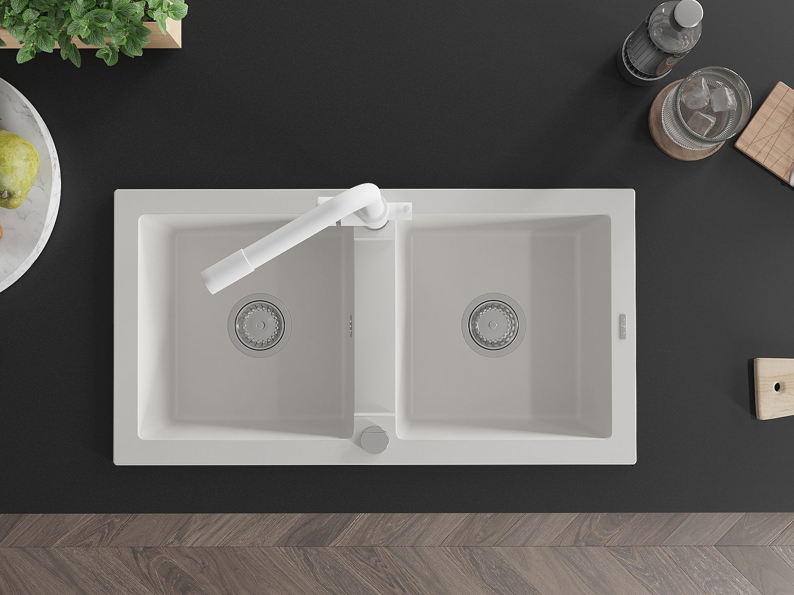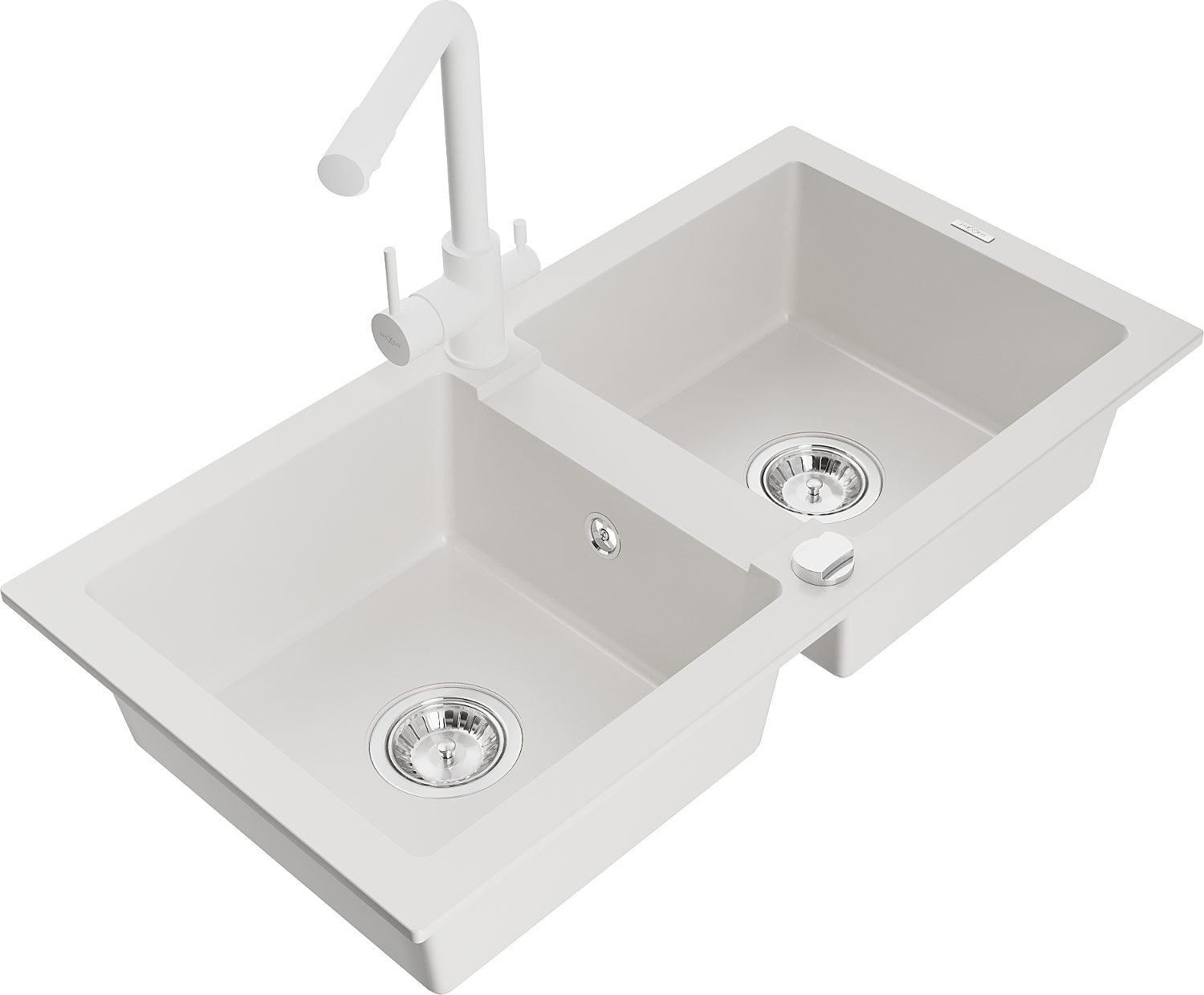 Mexen Mario divpadsmit granīta izlietne ar divām nodalījumiem un virtuves jaucējkrānu Duero, balta - 6504-20-671600-20