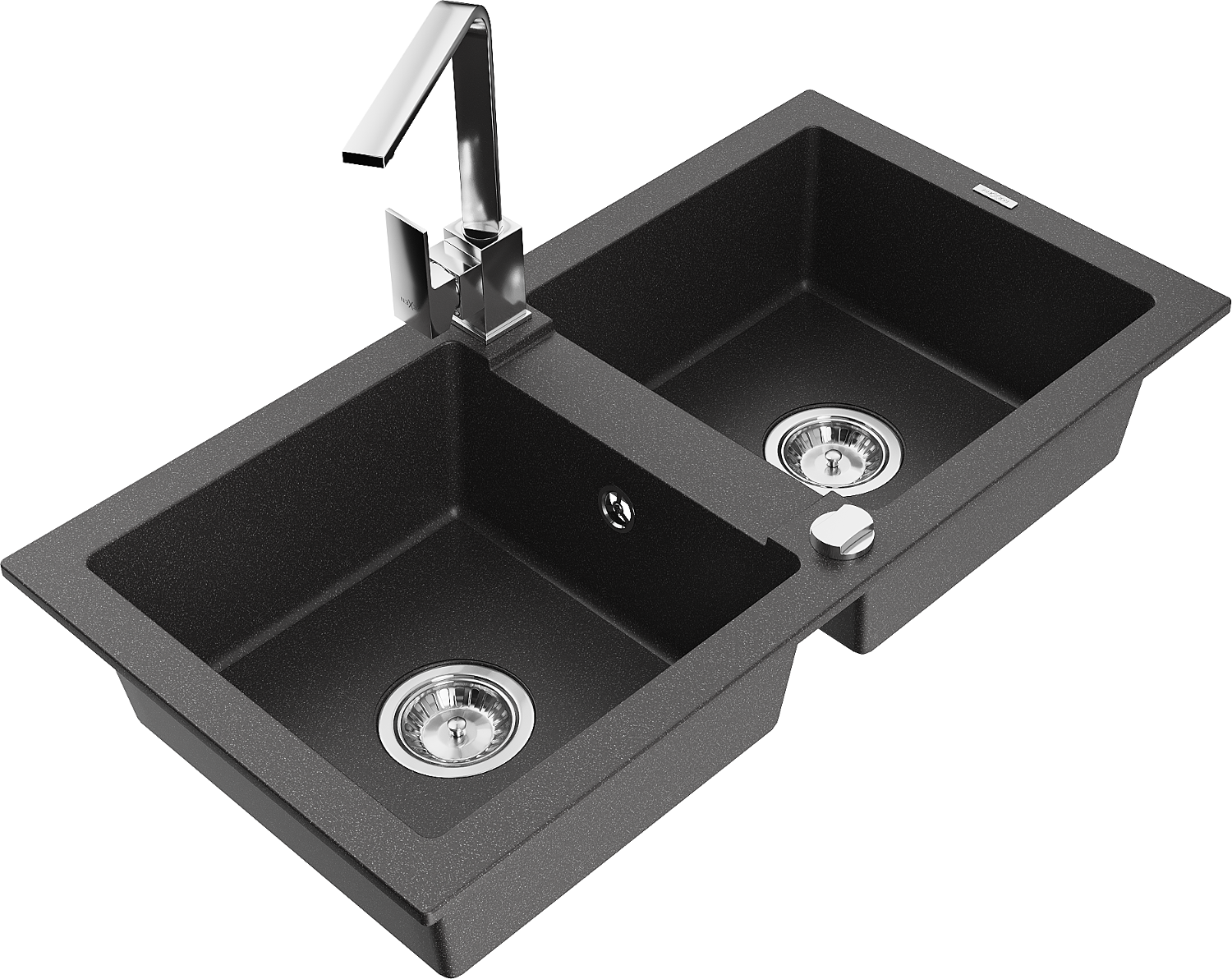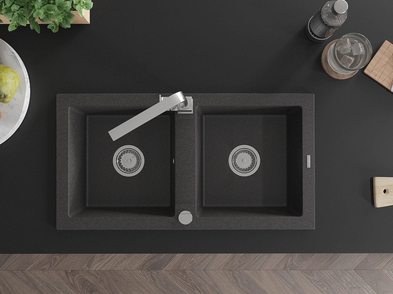 Mexen Mario granitā izlietne ar 2 nodalījumiem un virtuves jaucējkrānu Rita, melna ar punktiem - 6504-76-670300-00