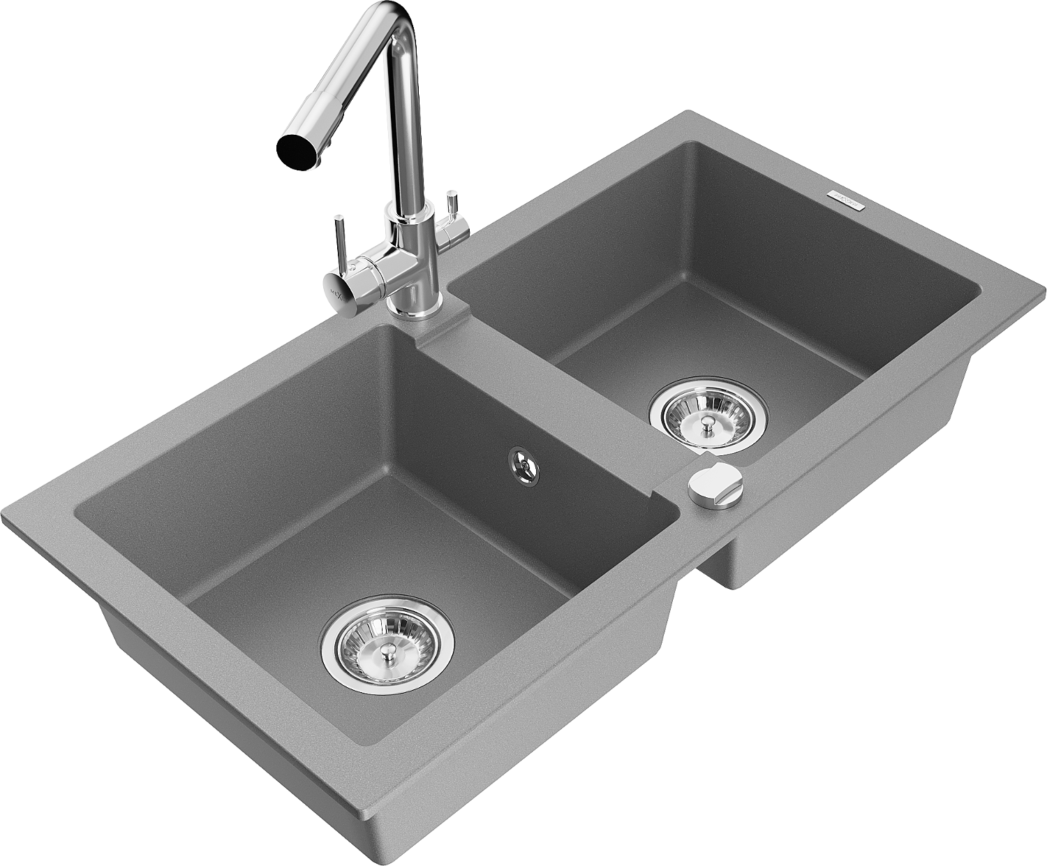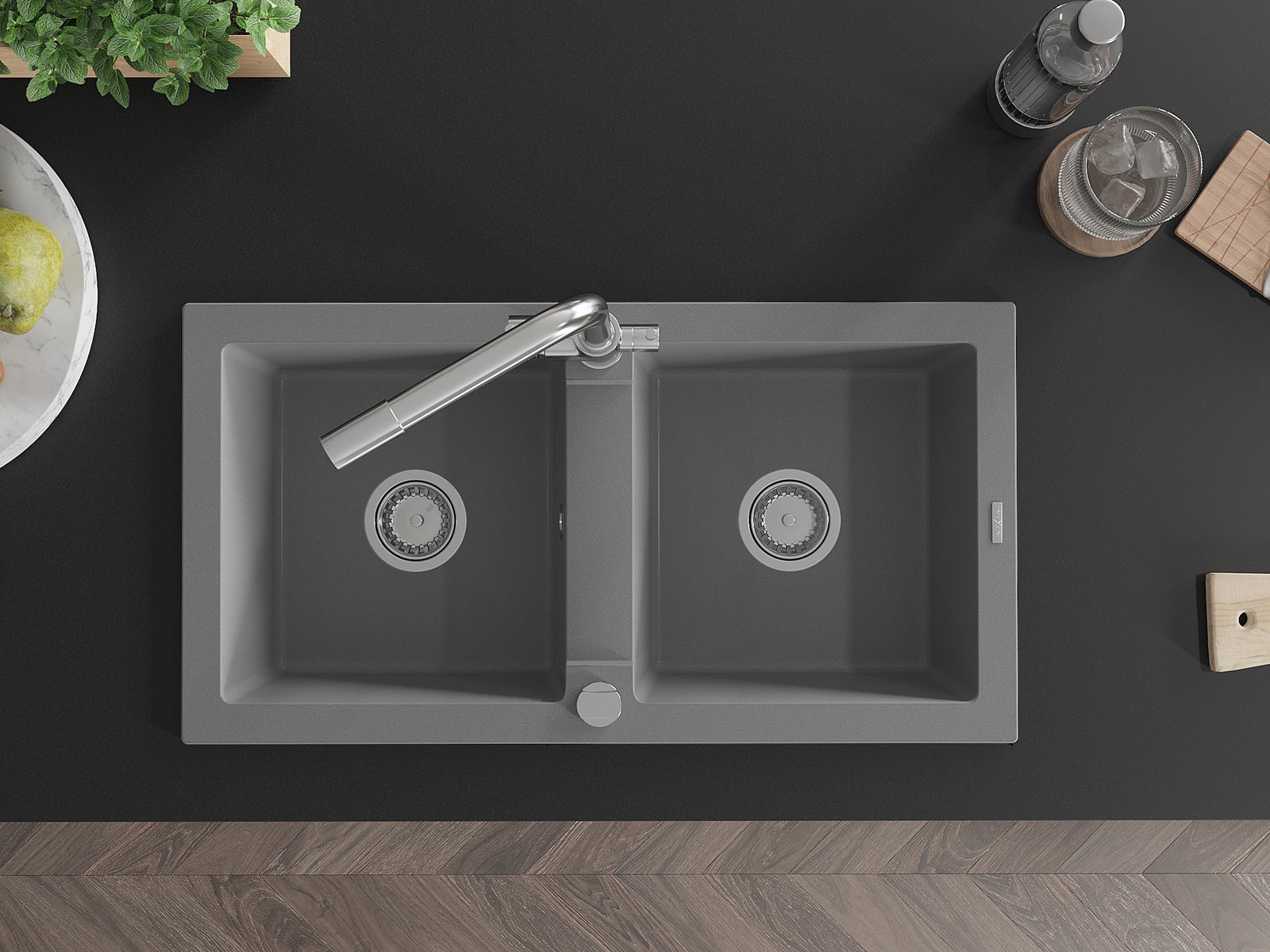 Mexen Mario granitizlietne izlietne ar divām nodalījumiem un virtuves jaucējkrānu Duero, pelēks - 6504-71-671600-00