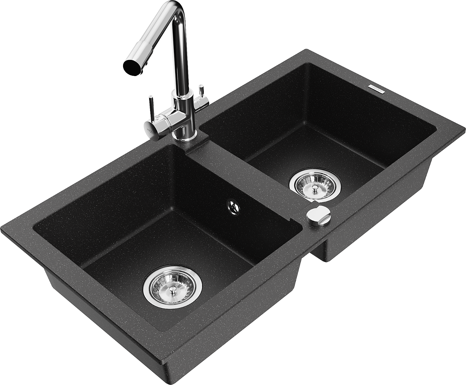 Mexen Mario granitā izlietne ar 2 nodalījumiem un virtuves jaucējkrānu Duero, melns/sudraba metāliskais - 6504-73-671600-00