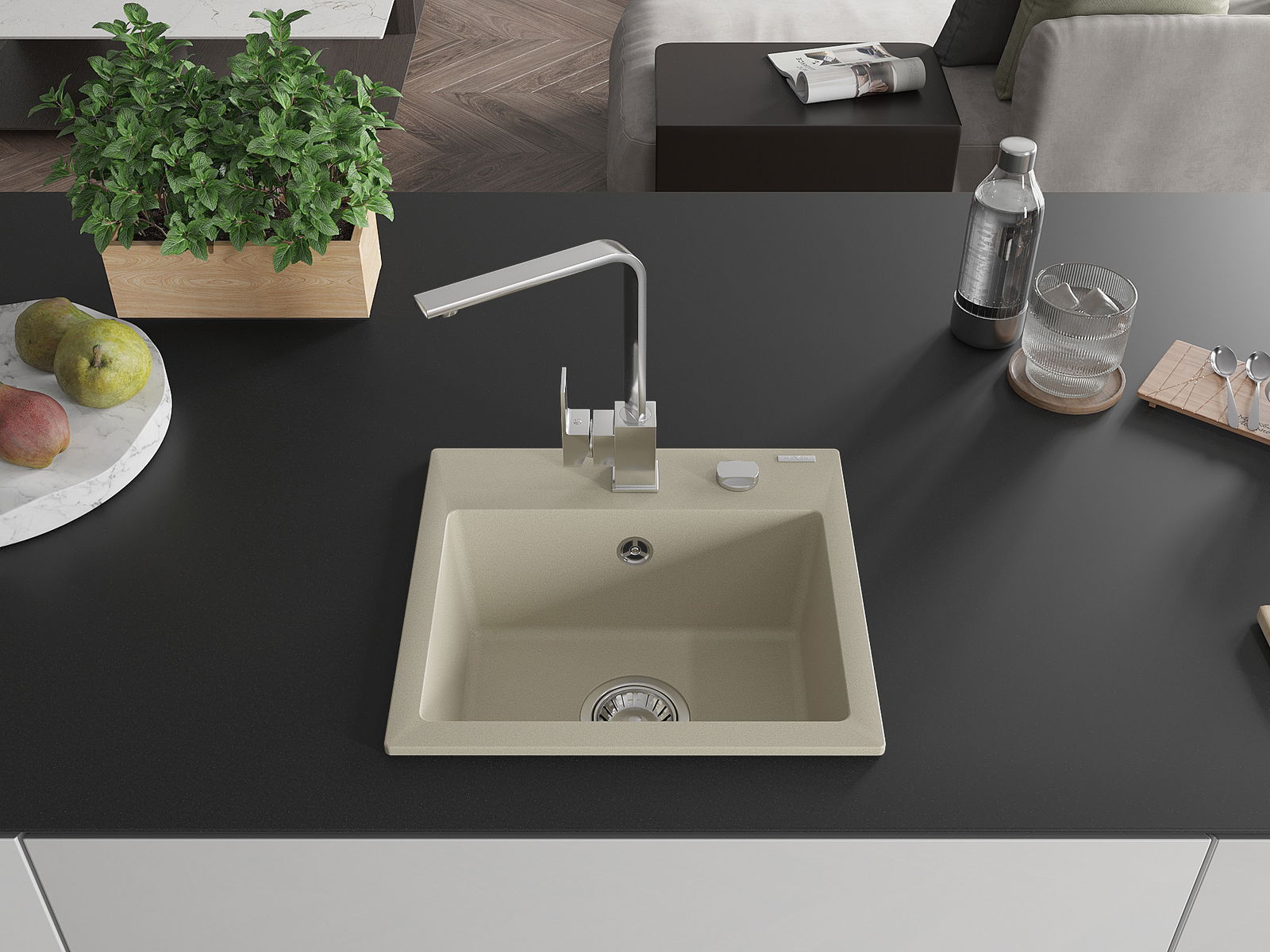 Mexen Milo granitā izlietne ar vienu nodalījumu un virtuves jaucējkrānu Rita, bēša - 6505-69-670300-00