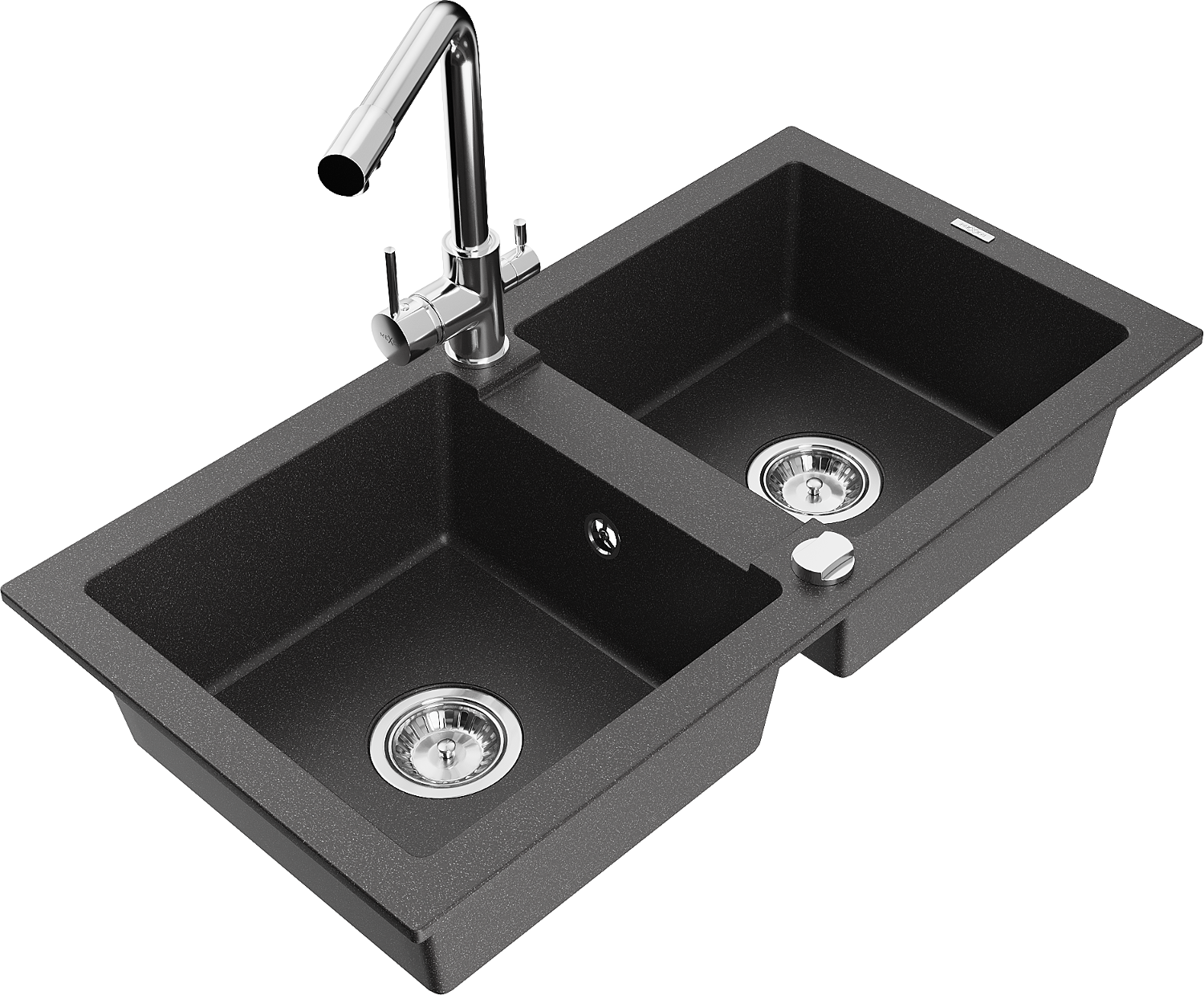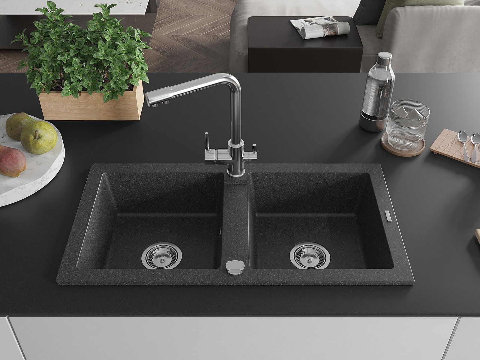 Mexen Mario granit izlietne ar diviem nodalījumiem un virtuves jaucējkrānu Duero, melns plankumains - 6504-76-671600-00