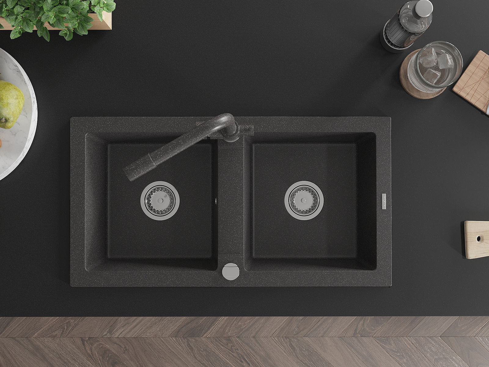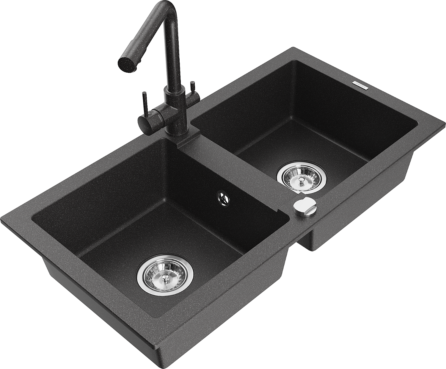 Mexen Mario granitais divu nodalījumu izlietne ar virtuves jaucējkrānu Duero, melns ar pārslapotu - 6504-76-671600-76