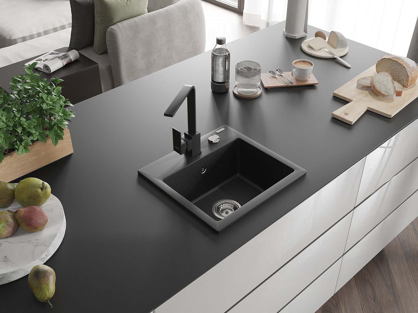 Mexen Milo granīta izlietne ar 1 nodalījumu ar virtuves jaucējkrānu Rita, melns/sudraba metālika - 6505-73-670300-70