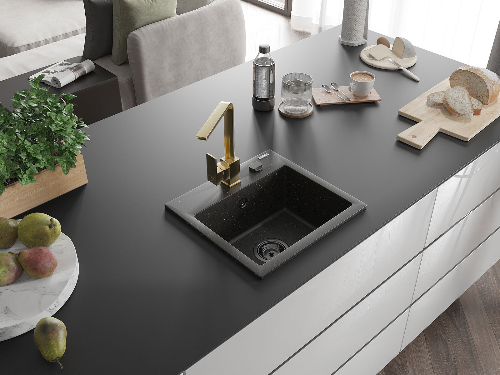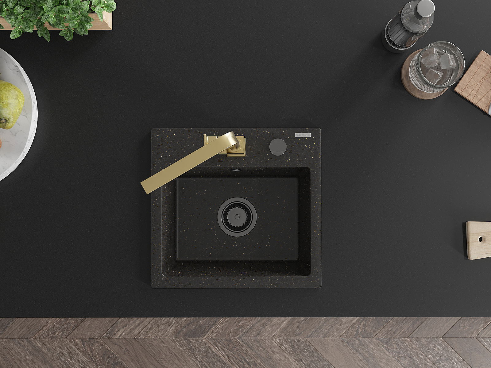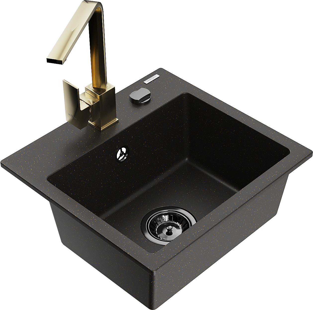 Mexen Milo granīta izlietne ar vienu nodalījumu un virtuves jaucējkrānu Rita, melns/zelta metāliks - 6505-75-670300-50-B
