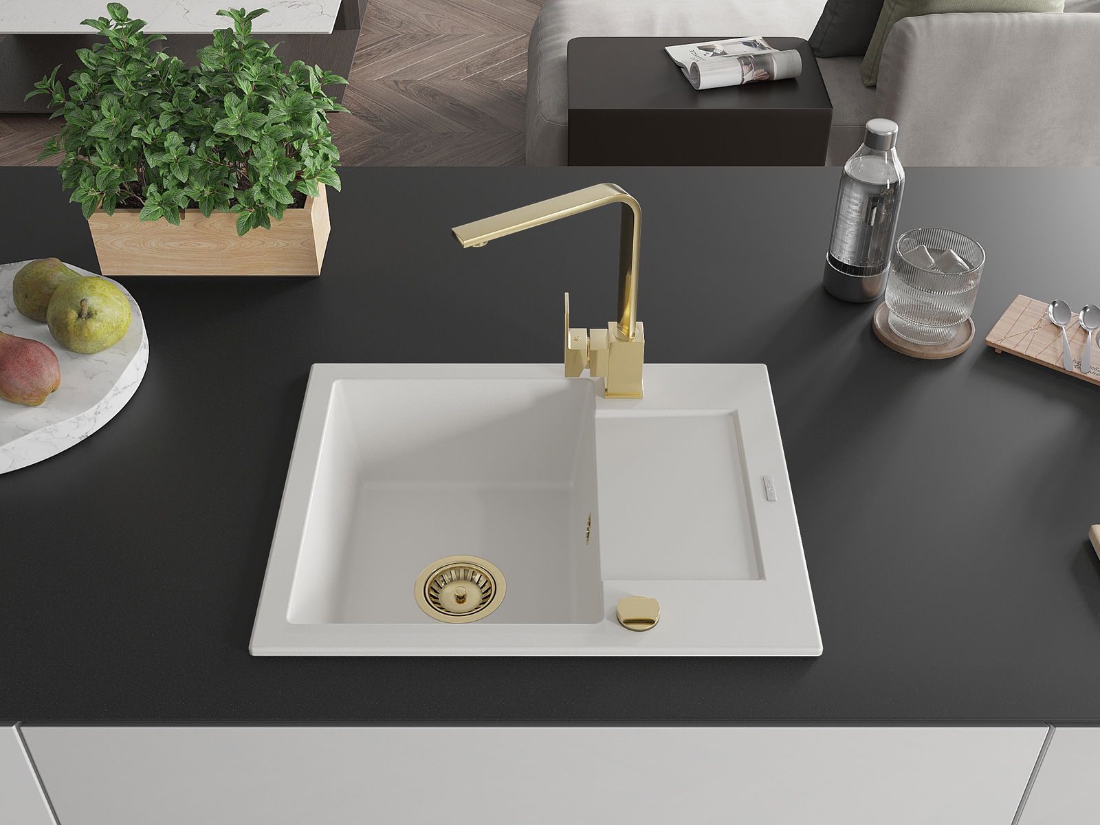 Mexen Enzo granitizlietne ar 1 nodalījumu ar noteces virsmu un virtuves jaucējkrānu Rita, balts - 6506-20-670300-50