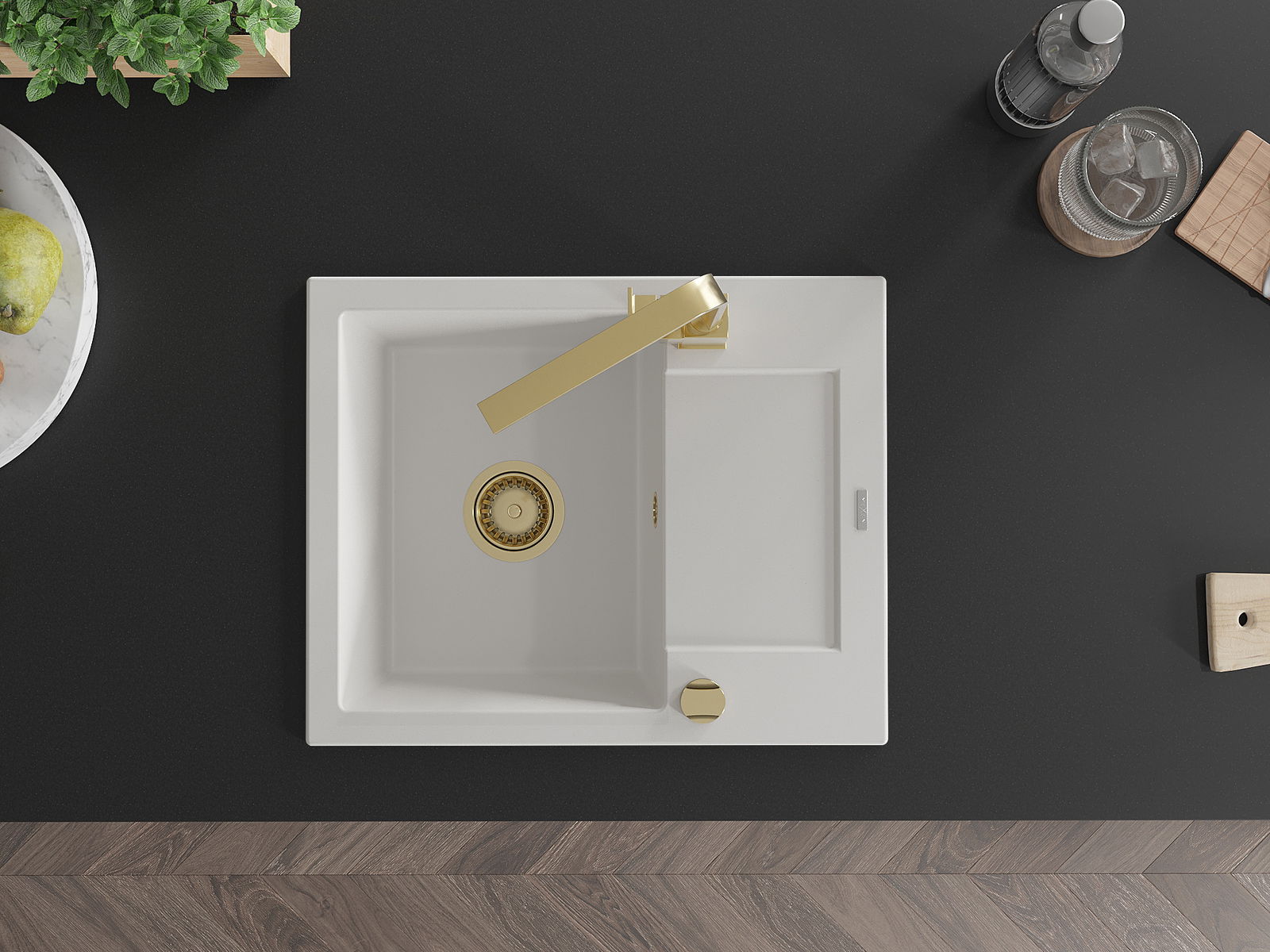 Izlietnei ir 2 daļēji izurbtas atveres ar diametru 35 mm, kuras var pašrocīgi izsist. Tās var izmantot, piemēram, šķidruma dozatora uzstādīšanai, kas novērsīs plastmasas pudeļu klātbūtni virtuvē un piešķirs tai elegantu apdari.