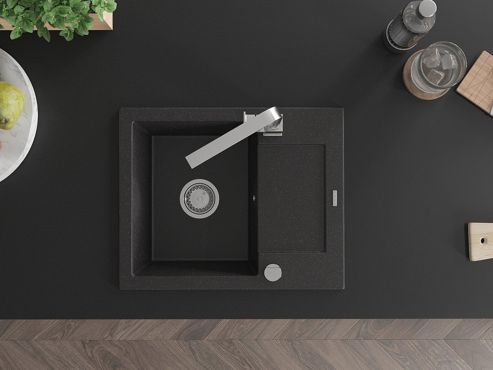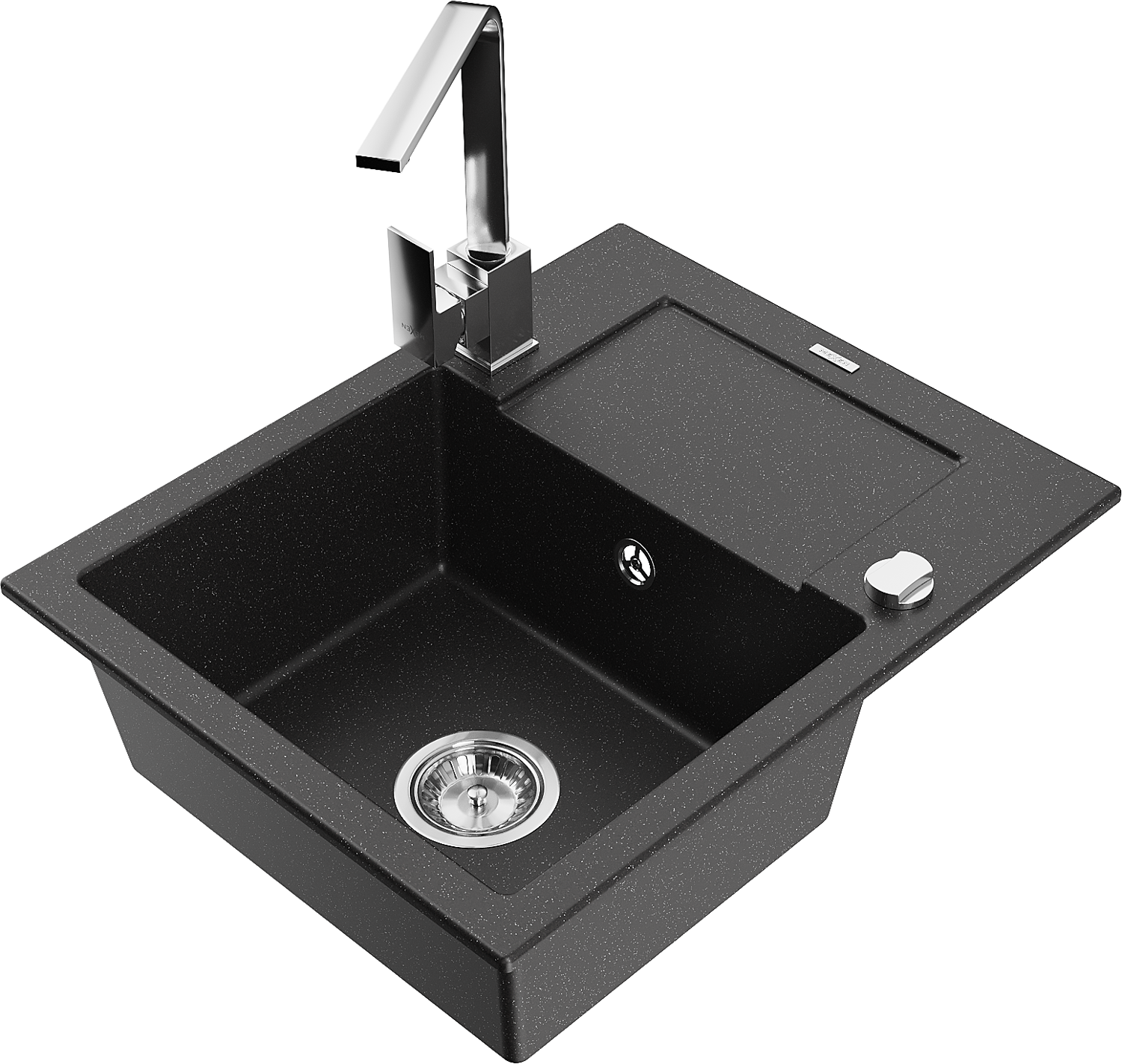 Mexen Enzo granitizlietne ar vienu nodalījumu un aizplūdi un virtuves jaucējkrānu Rita, melna/sudraba metālisks