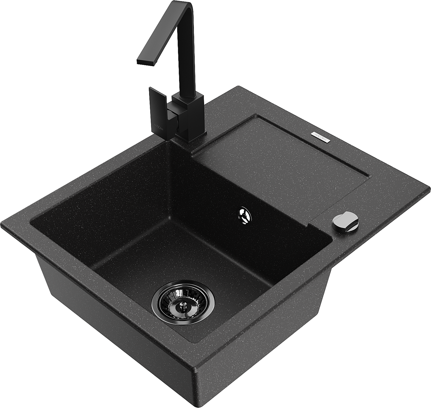 Mexen Enzo granīta izlietne ar vienu nodalījumu ar noteces zonu un virtuves jaucējkrānu Rita, melna/sudraba metālika