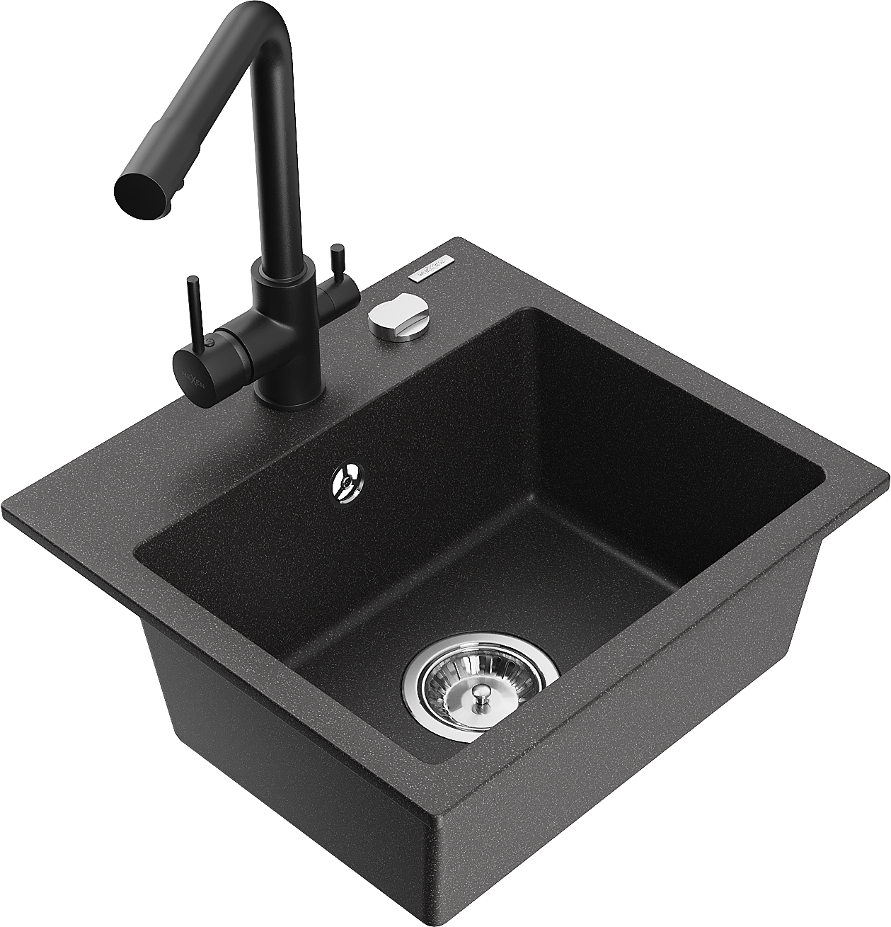 Mexen Milo granīta izlietne ar vienu nodalījumu un virtuves jaucējkrāns Duero, melns ar sprādzieniem - 6505-76-671600-70