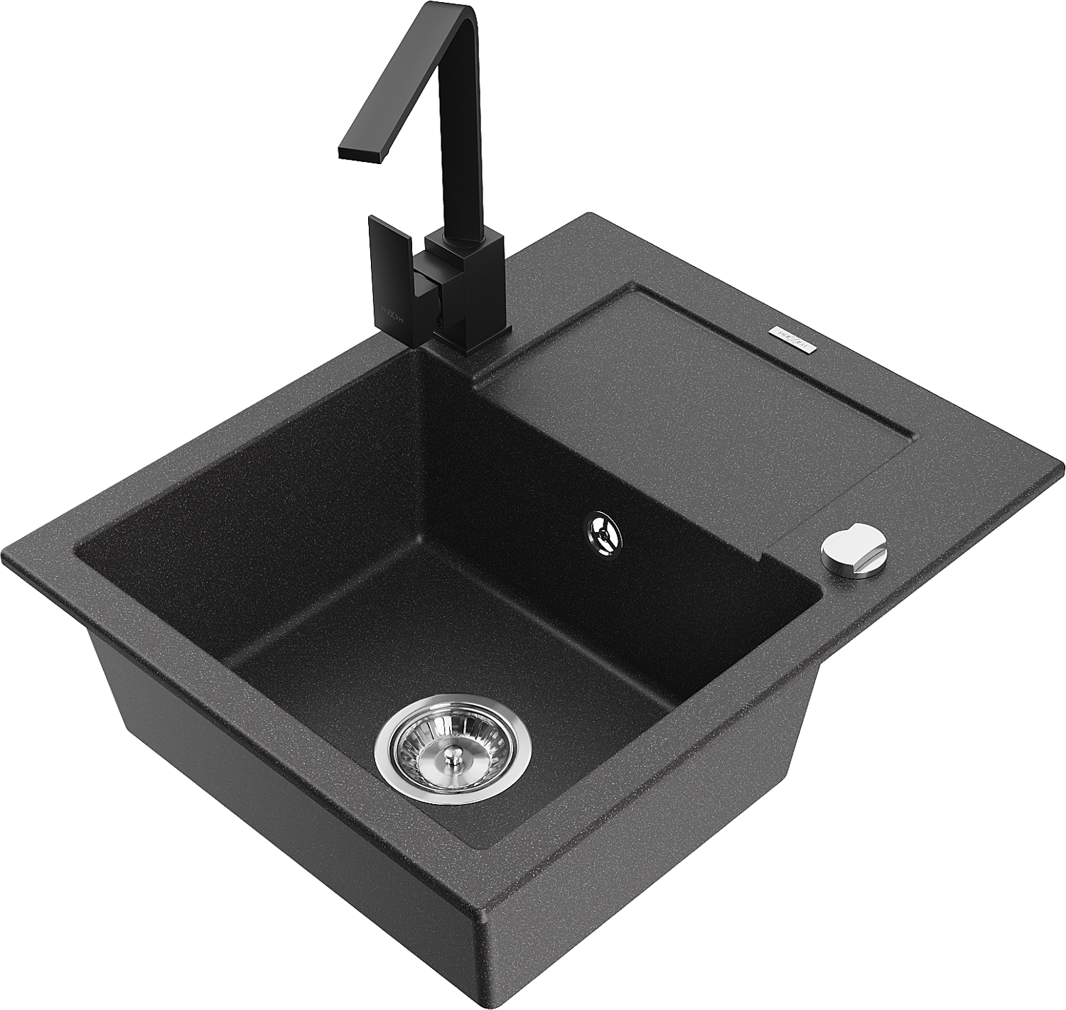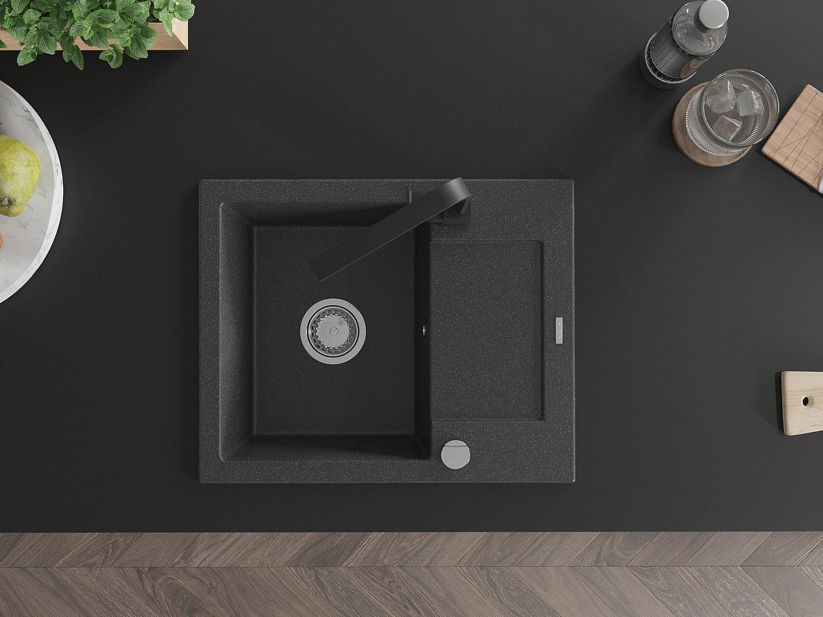 Mexen Enzo granitizlietne ar vienu kameru un notekpaplāti, ar virtuves jaucējkrānu Rita, melna ar punktiņiem