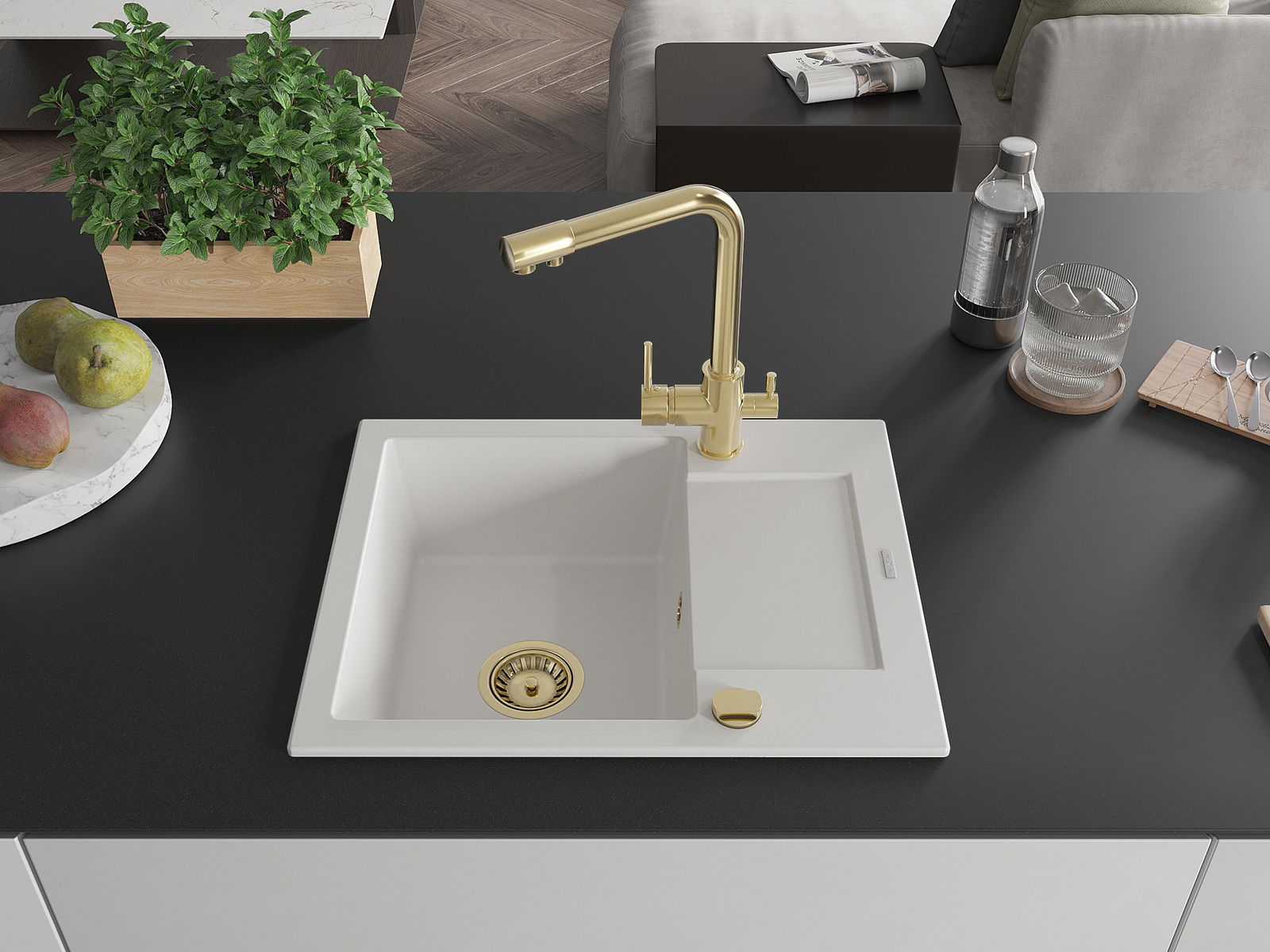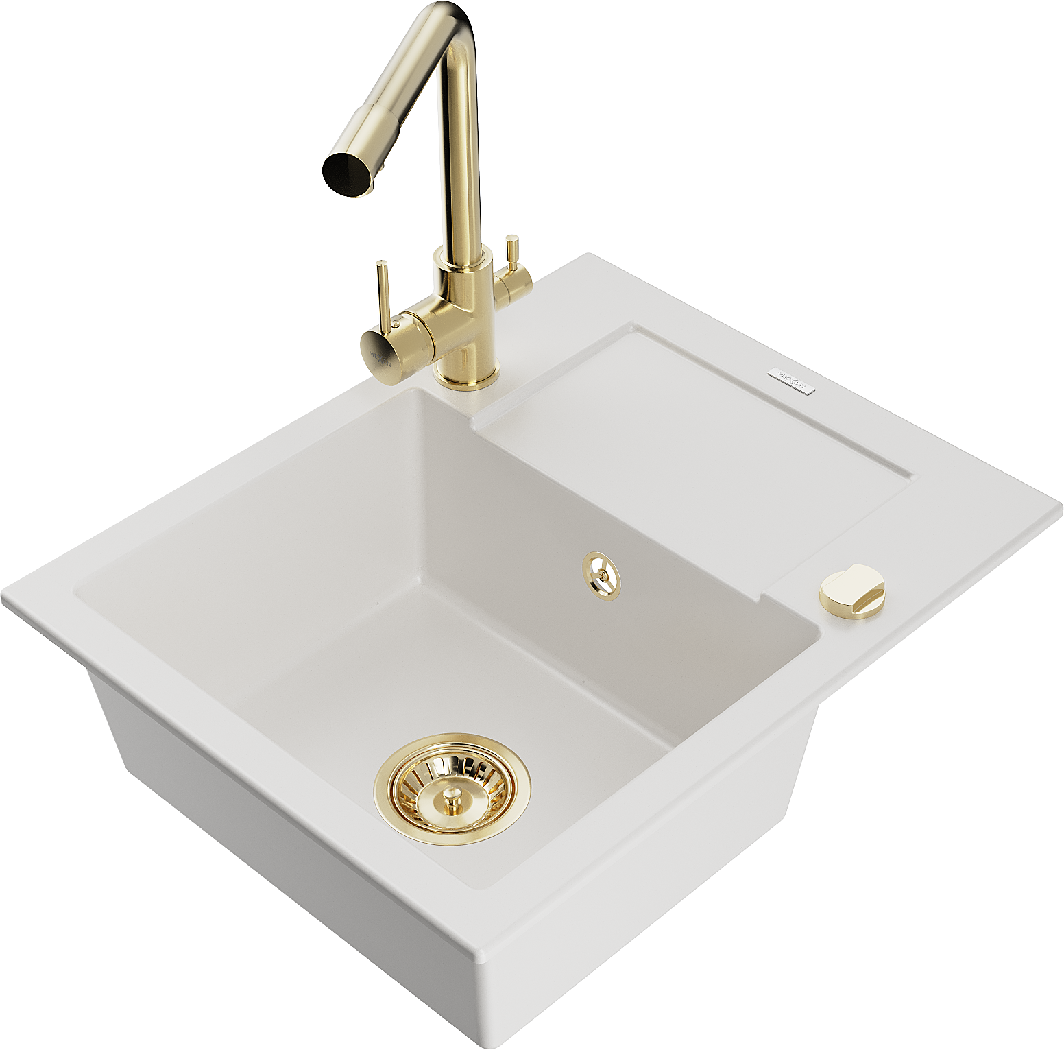 Mexen Enzo Grants izlietne ar vienu nodalījumu un noteces vietu, un virtuves jaucējkrānu Duero, balts - 6506-20-671600-50